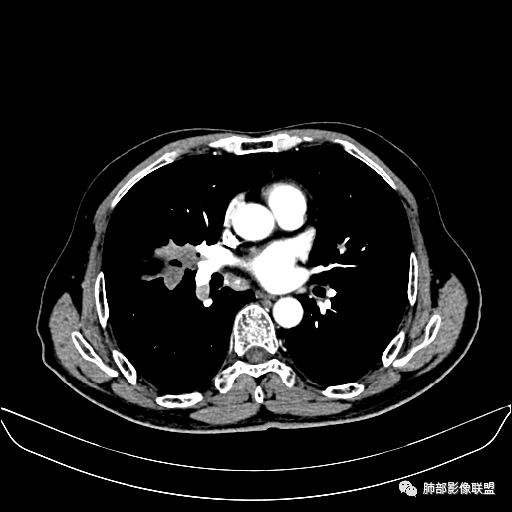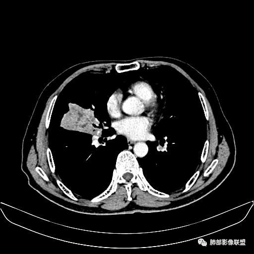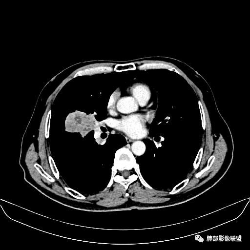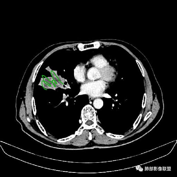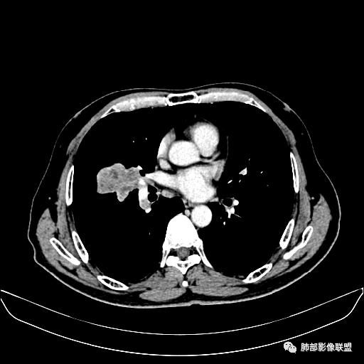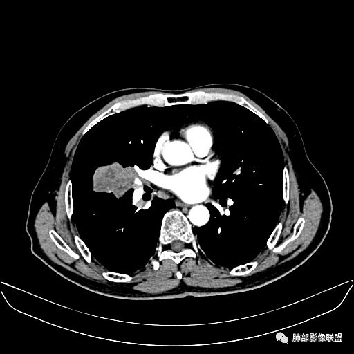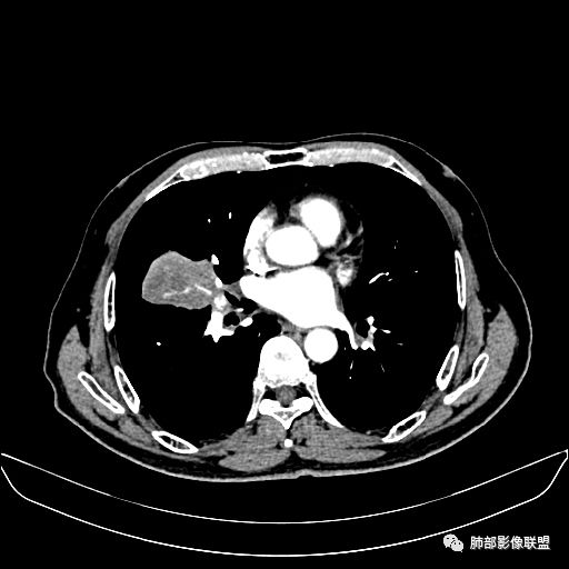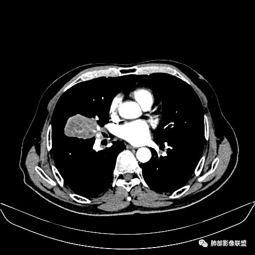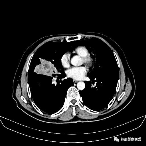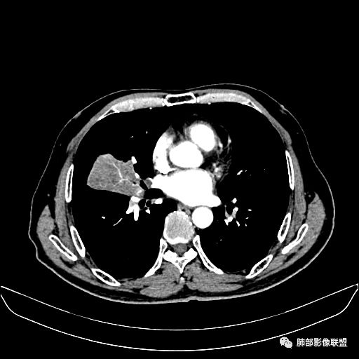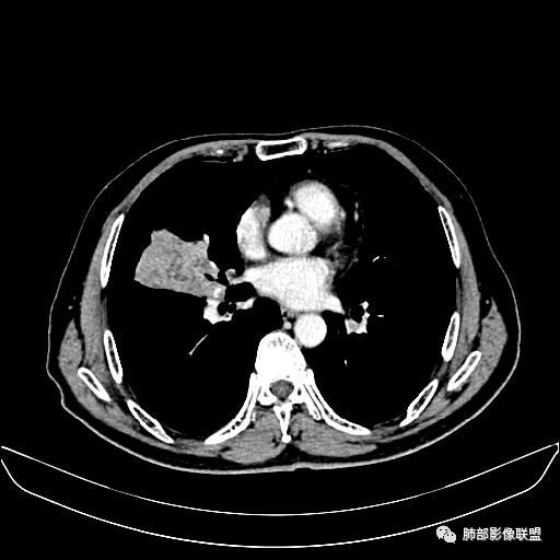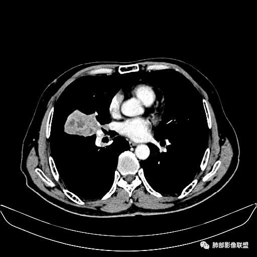 右肺中叶软组织肿块,外围向内生长,叶间胸膜向前内移位,肿块近肺门侧跨叶,中叶外侧段支气管截断,密度不均匀,双侧肺门及隆突下见肿大淋巴结,增强后呈中度不均质强化,肺动脉供血,多发坏死区,边界尚清,坏死区域内见结构,结合病史考虑恶性,鉴别诊断1结核,爬行征是沿支气管树分布,外宽,内窄,周围有卫星灶,内气管狭窄后扩张,此例沿叶间胸膜长轴分布,气管有截断,不典型。2炎性肉芽肿,符合的地方下方层面增强后延迟性轻度环形强化,不符临床无发热等急性感染病史,实验室指标不符,病灶周围渗出及慢性炎性改变有,不明显。