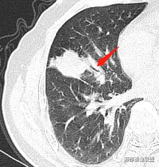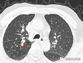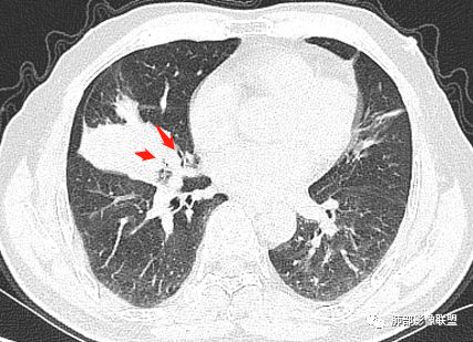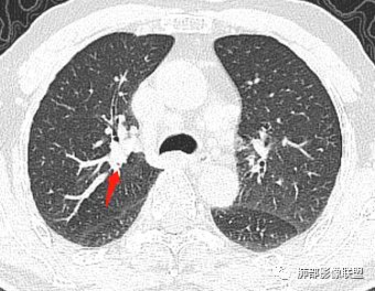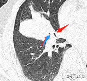 影像上叶后段支气管壁增厚,附近似有淋巴结有气体潴留