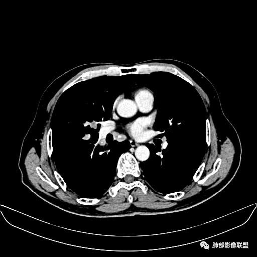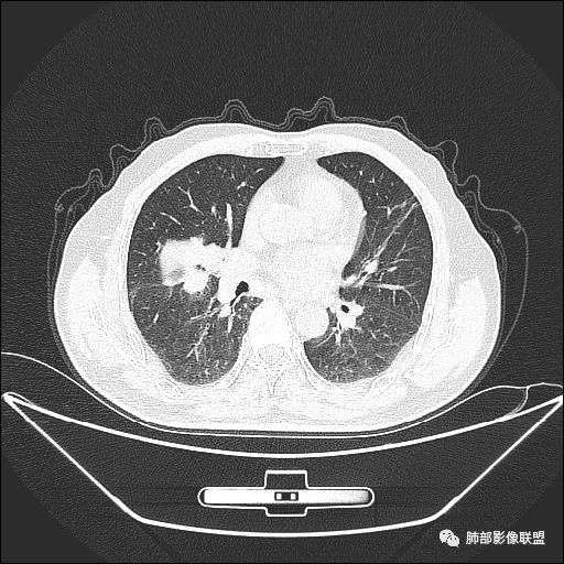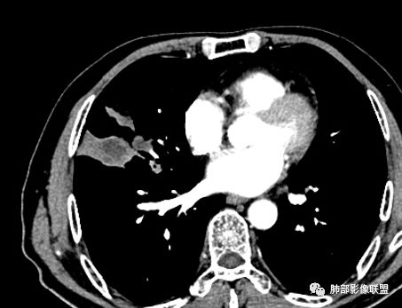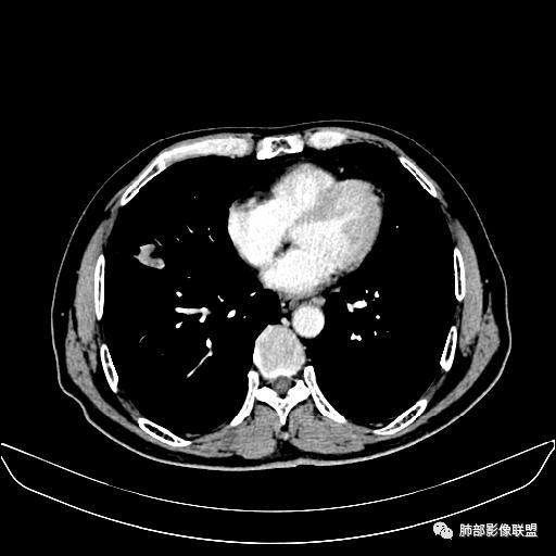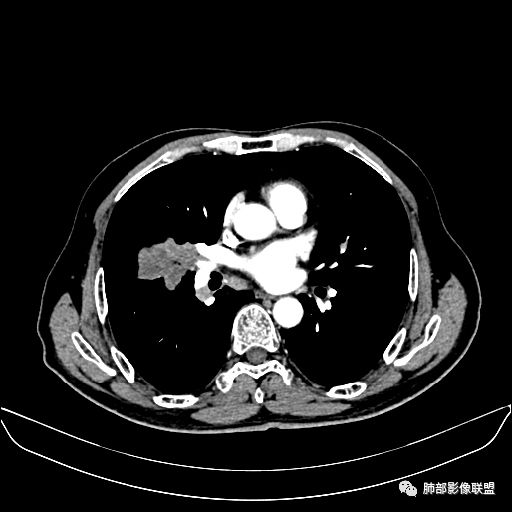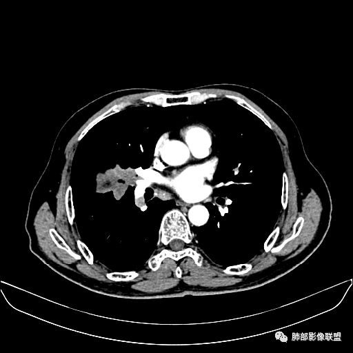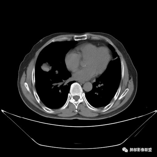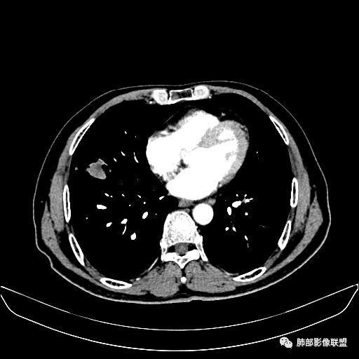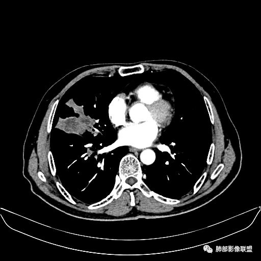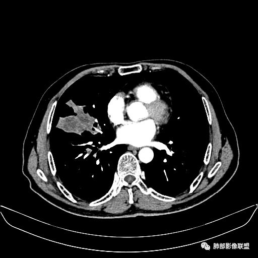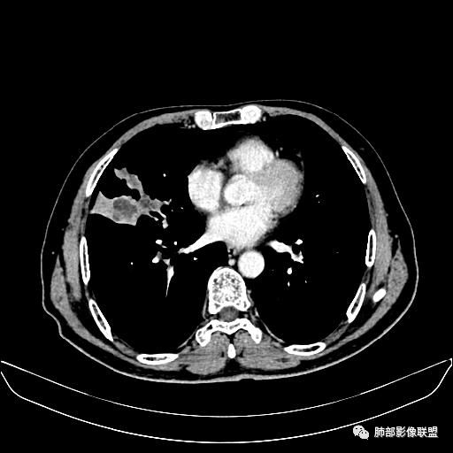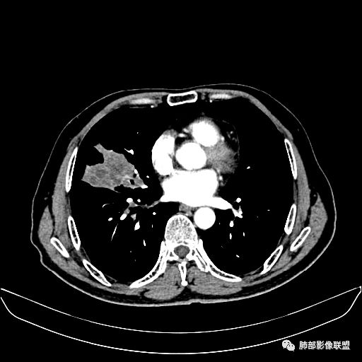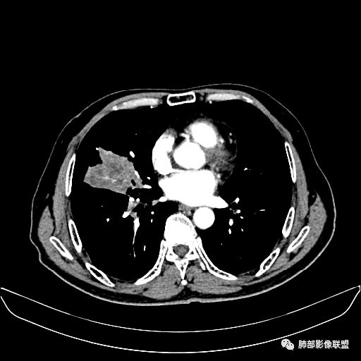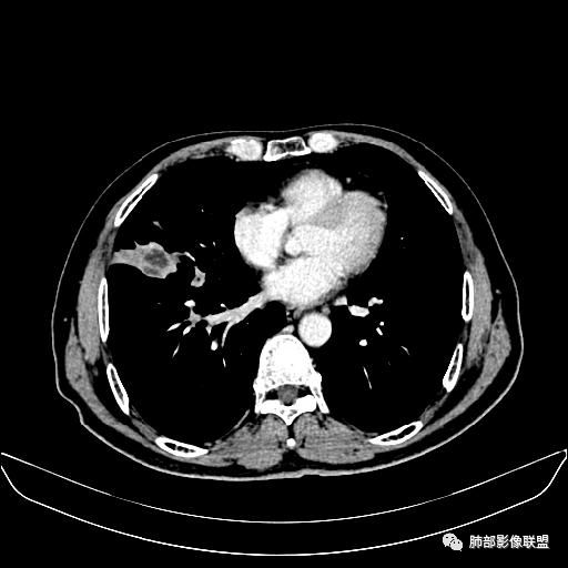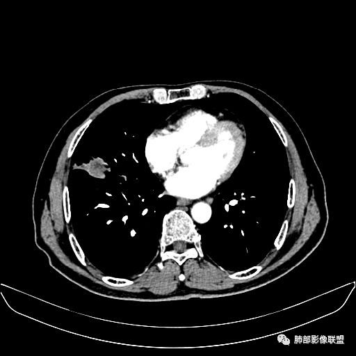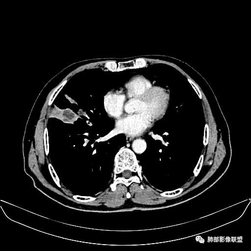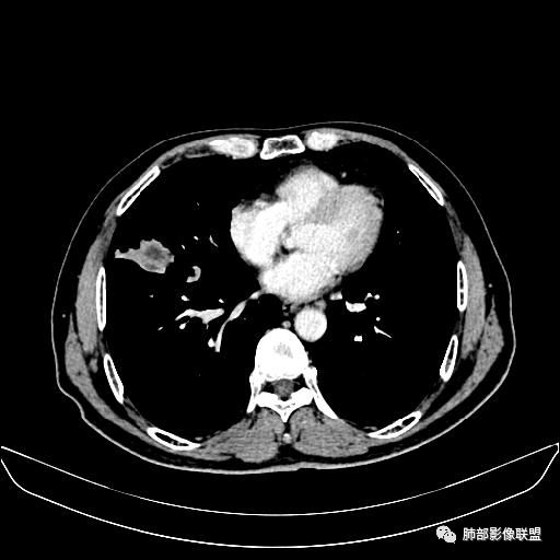 老年男性,亚急性病程,咳嗽咳痰。右肺中叶团片影,外朝内分布,大部分边界清楚平直,内侧支气管进入,团片影见低密度坏死区,强化明显,延迟强化,血管破坏不明显,符合爬行征5个特点: