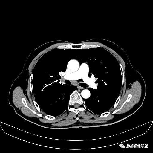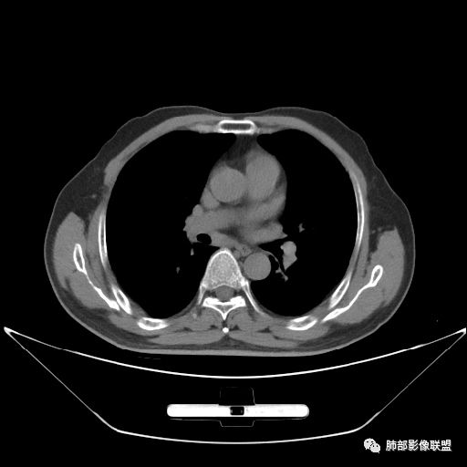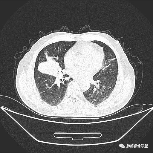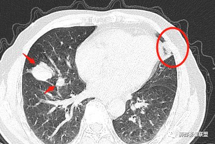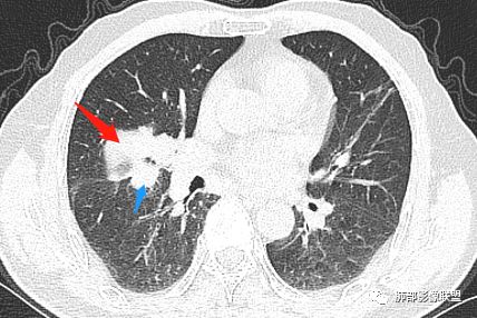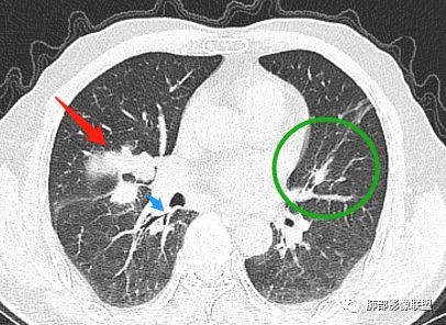主病灶在中叶,但是左肺舌段叶有条索影,陈旧病变。蓝色箭头支气管受压,是淋巴结肿大