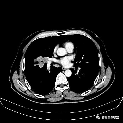 老年男性,因“咳嗽咳痰1月余。”入院。病程中咳嗽咳痰,咳黄白痰,间断咯少许鲜红色痰血。PPD阳性。胸CT:右肺中叶外侧段支气管管腔阻塞,大片实性病变,病灶边缘光滑,部分边缘膨隆,可见分叶,肺门及纵隔可见肿大淋巴结,并可见钙化。增强可见病灶明显强化,而且延迟强化明显,病灶内多发低密度区,内见血管影,血管变细、部分血管破坏。考虑恶性病变可能性大,鉴别慢性肉芽肿性病变。