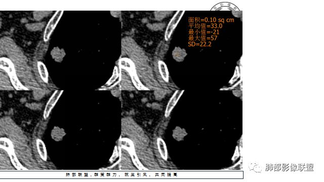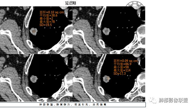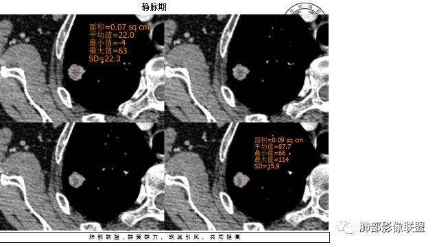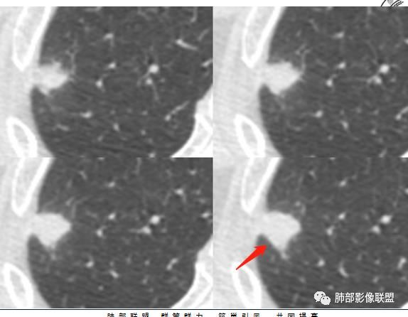 胸CT:右上肺结节,病灶位于胸膜下,边缘可见平直 u型征 软毛刺 晕,增强可见延迟强化,病灶中心低密度区。