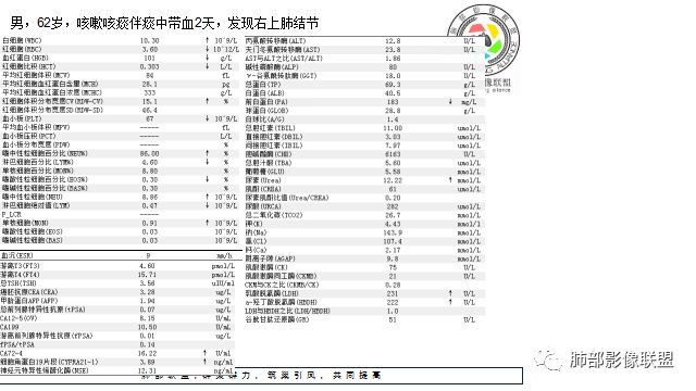 患者老年男性,咳痰伴痰中带血2天,发现右上肺结节入院。血象高,血小板低。