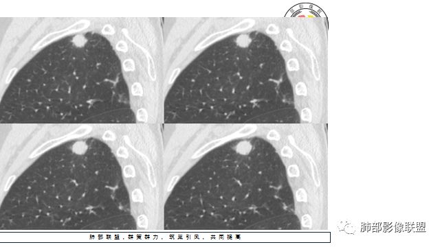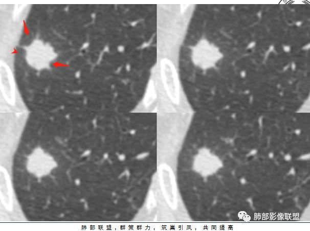 老年男性,右肺上叶近胸膜下结节,部分边缘略膨隆,边缘可见多发长毛刺,并可见支气管影,不知道远端是否阻塞,增强后边缘有强化,内可见坏死,恶性不能除外