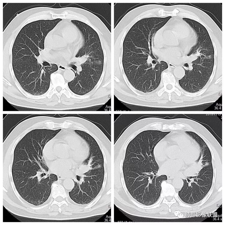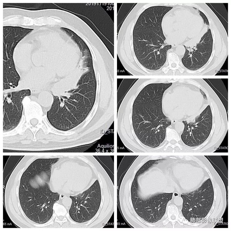 1.主病灶明显堵塞支气管,我觉得如果结核爬行,应该是外向内爬,这个我觉得是内向外堵塞,而且爬行的结核一般是肉芽肿,不是坏死,增强不会这么低,这个密度和强化比较符合一个坏死。最重要鉴别,结核的爬行是外向内,周围有树丫。这个是内向外,支气管堵塞且坏死明显,外周的堵塞性肺不张,没有树丫,所以主病灶考虑内向外,故结核爬行不太符合。而中央型腺癌不是没有,而是少,加上坏死这么明显,淋巴结转移不明显,故猜测鳞癌或者唾液腺肿瘤可能性比较大,因为后者也是支气管中央起源,强化比较弱的。腺癌和小细胞不太典型,类癌可以表现为支气管粘液栓,但是强化不够。
