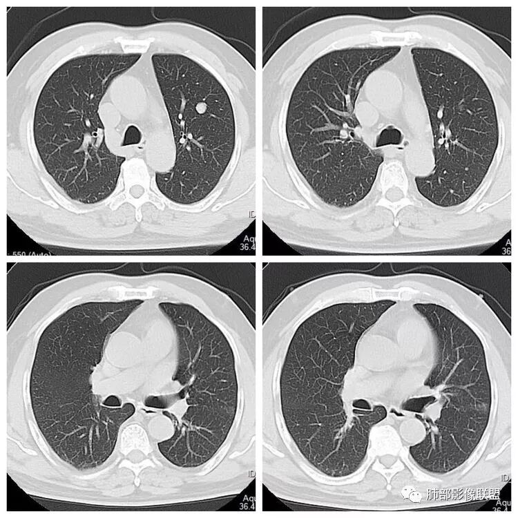 3.左肺上叶另见孤立结节影,边界清楚光整,中央钙化,未见脂质密度特征。