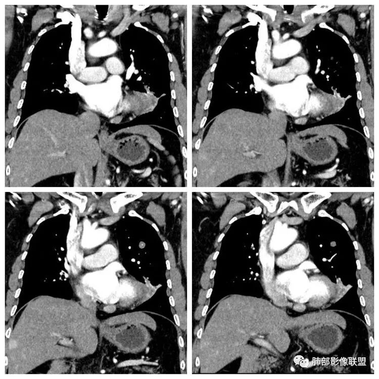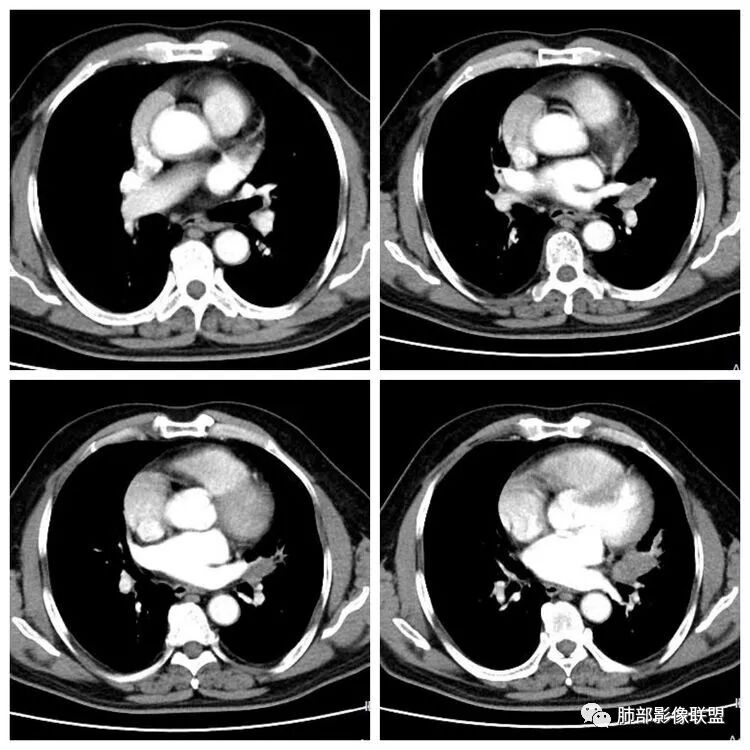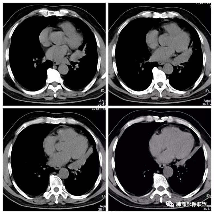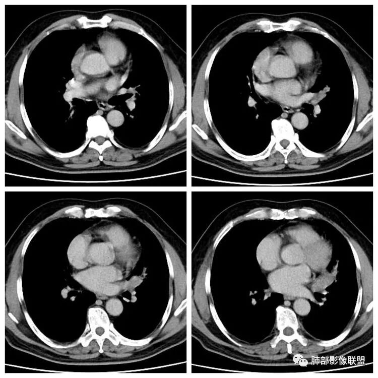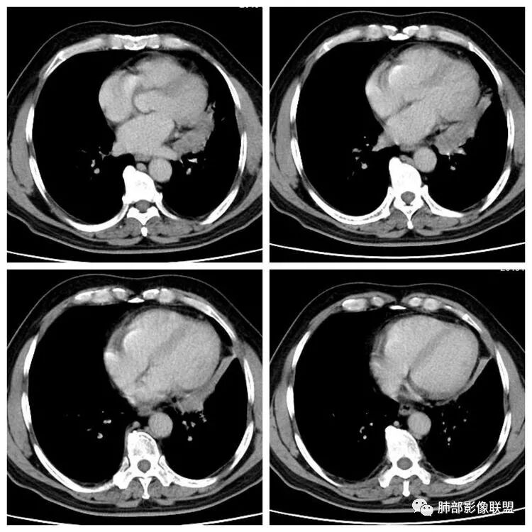 4.增强扫描左肺门区块影轻度强化,强化程度轻于舌段周围不张肺组织。