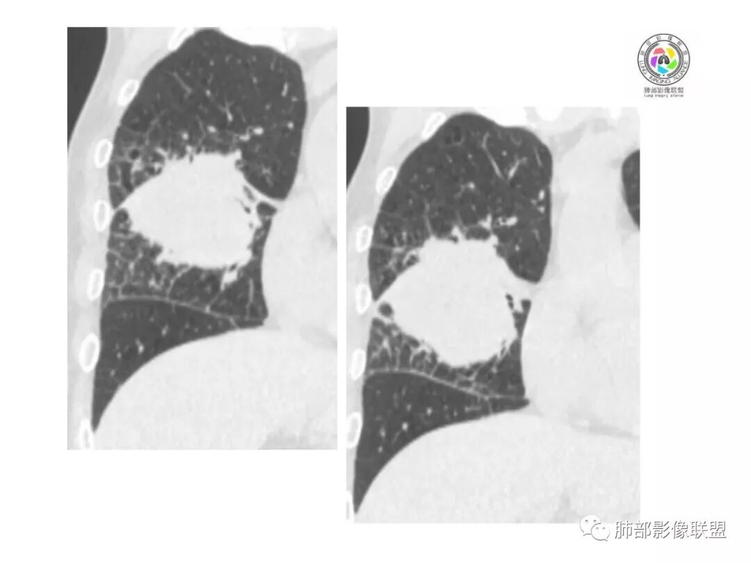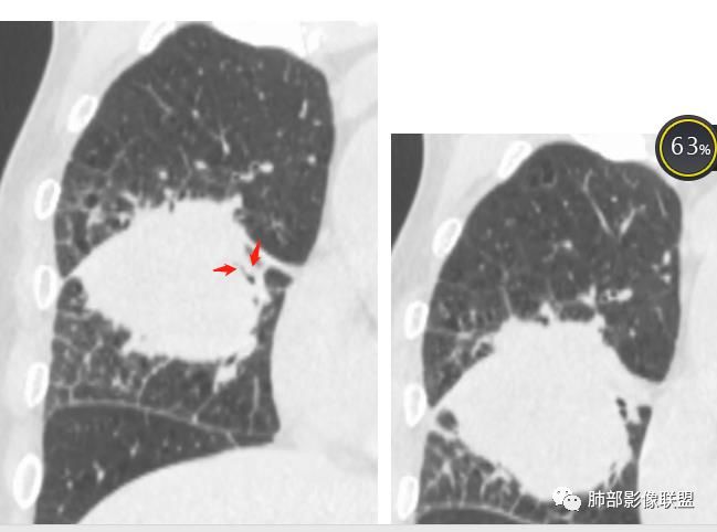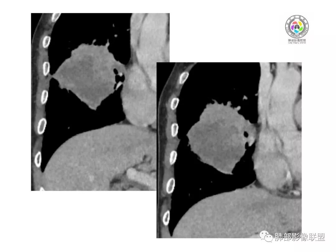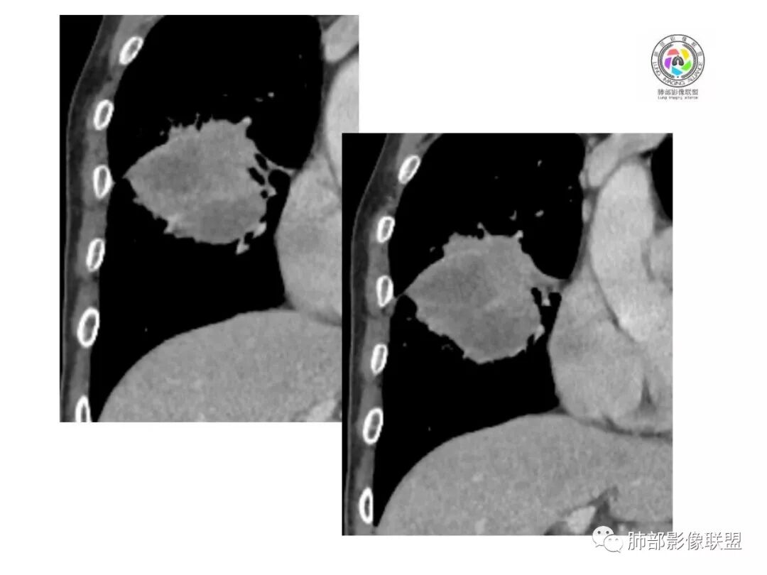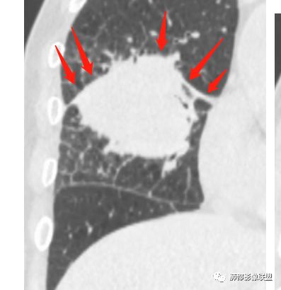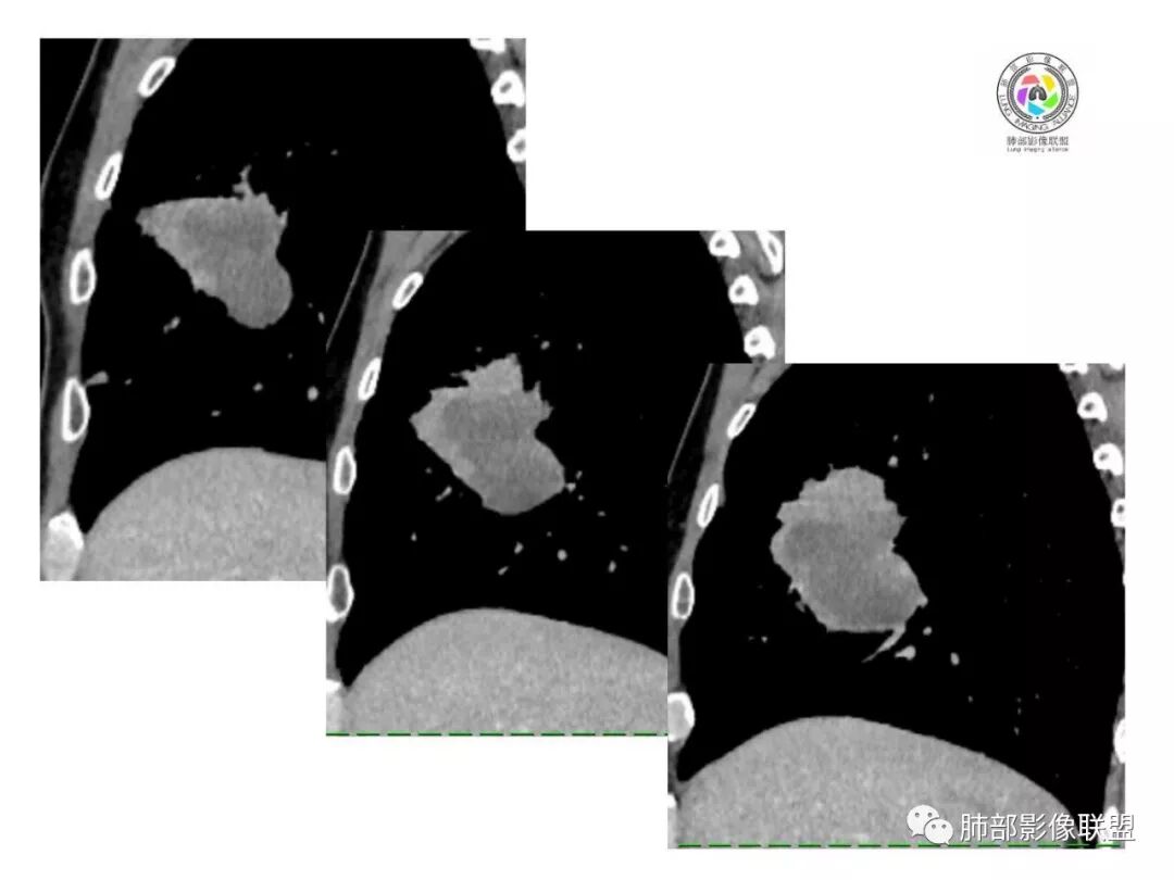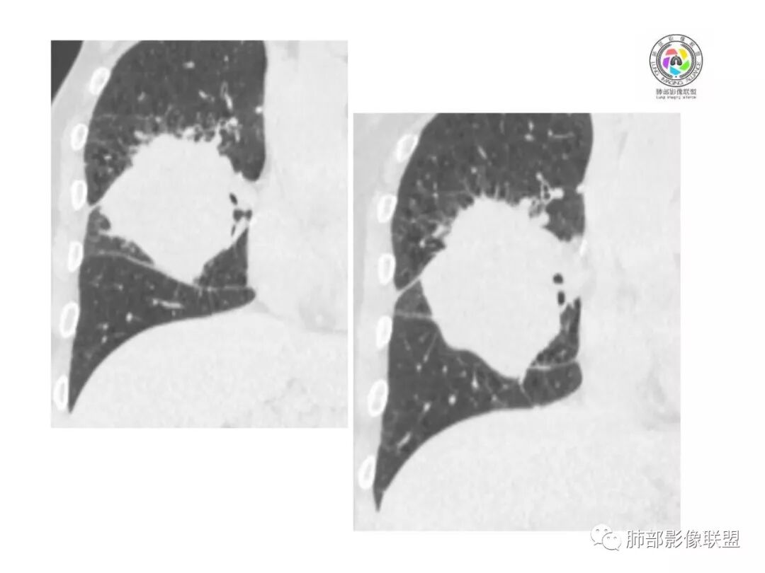 @吴婧南京市第一医院 这个从影像表现,坏死情况,以及叶裂推移情况与支气管推移情况来看,还是支持中叶间质来源,外朝内生长,同时向上,向下,向内都有推移作用。