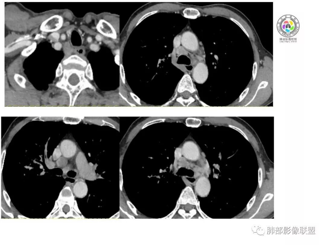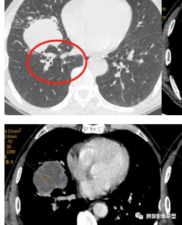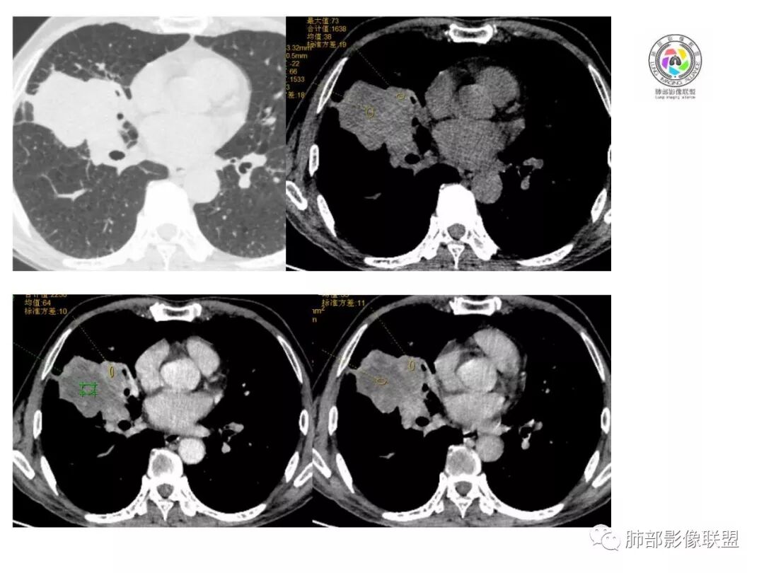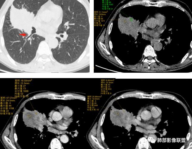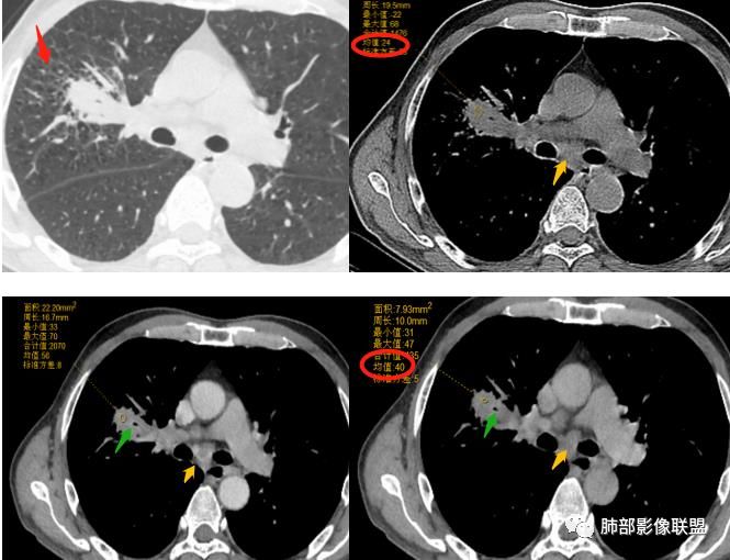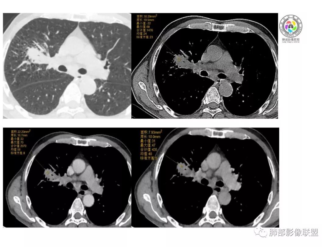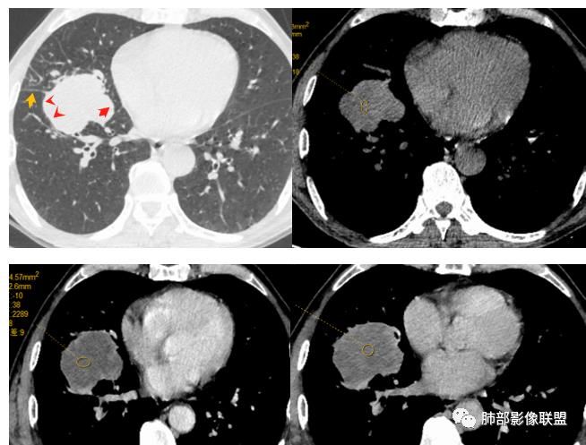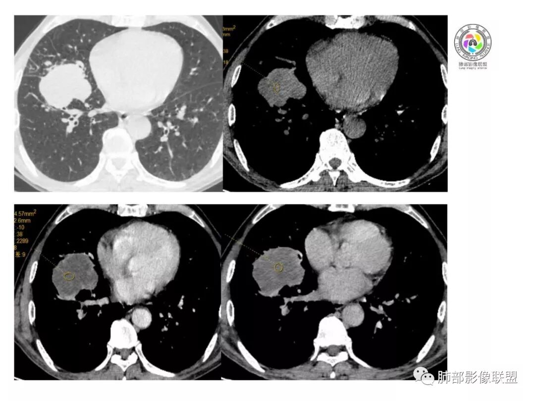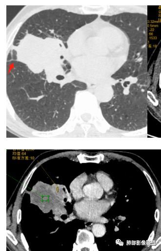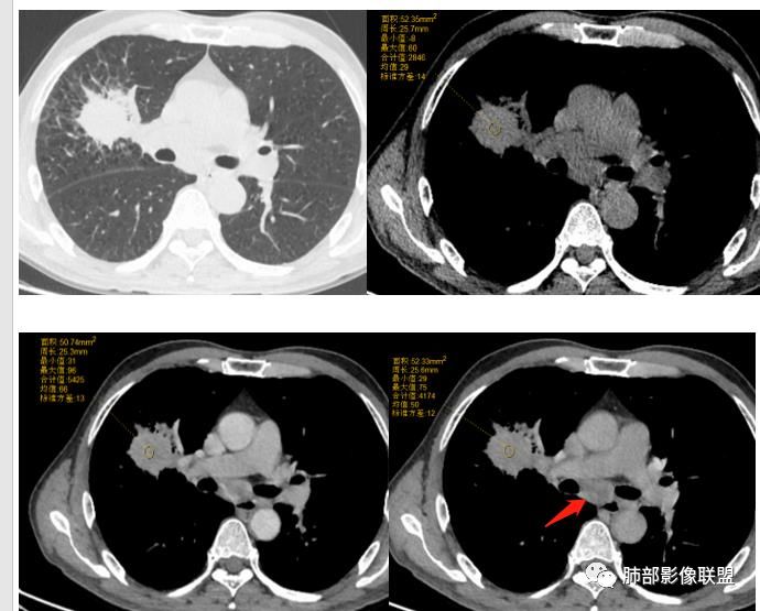 这一片病灶是右肺上叶,里面可以看的支气管走进去,然后纵隔淋巴结肿大,增强后有中度强化