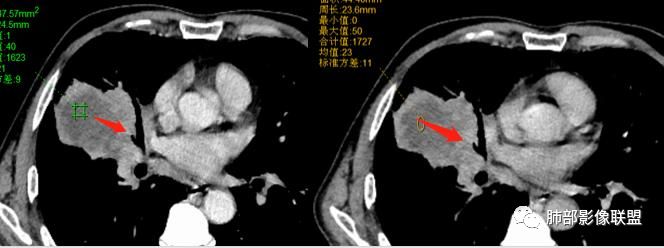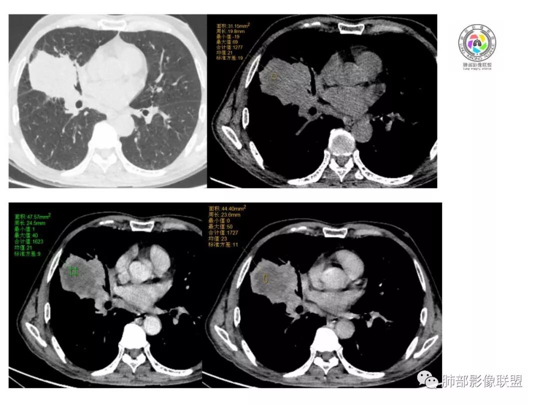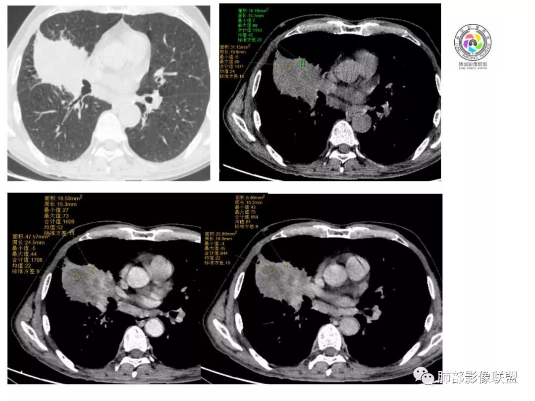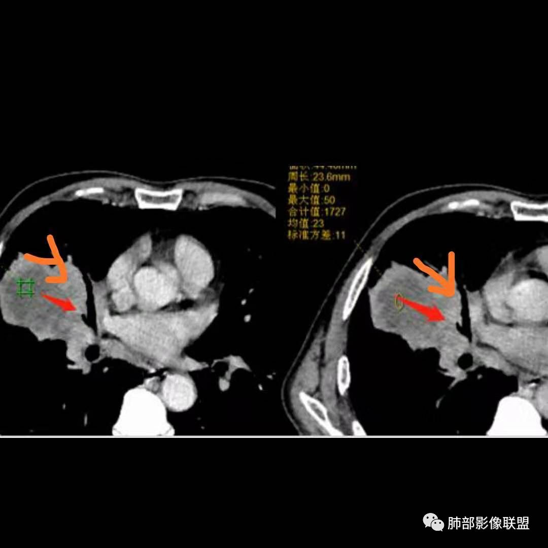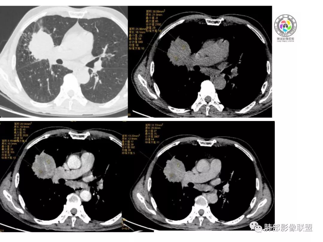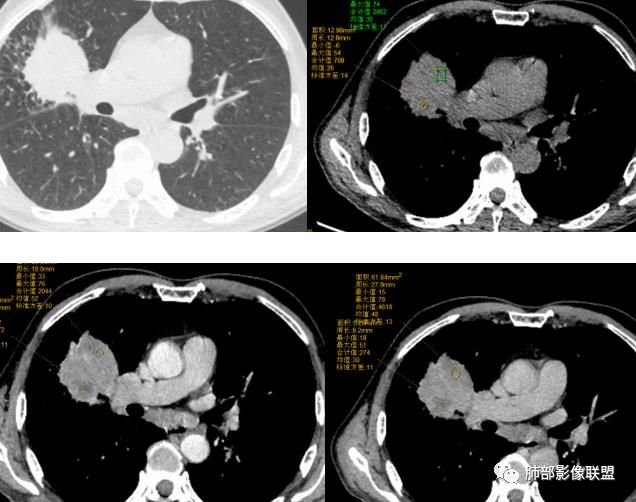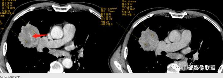 这一片病灶是右肺上叶,里面可以看的支气管走进去,然后纵隔淋巴结肿大,增强后有中度强化