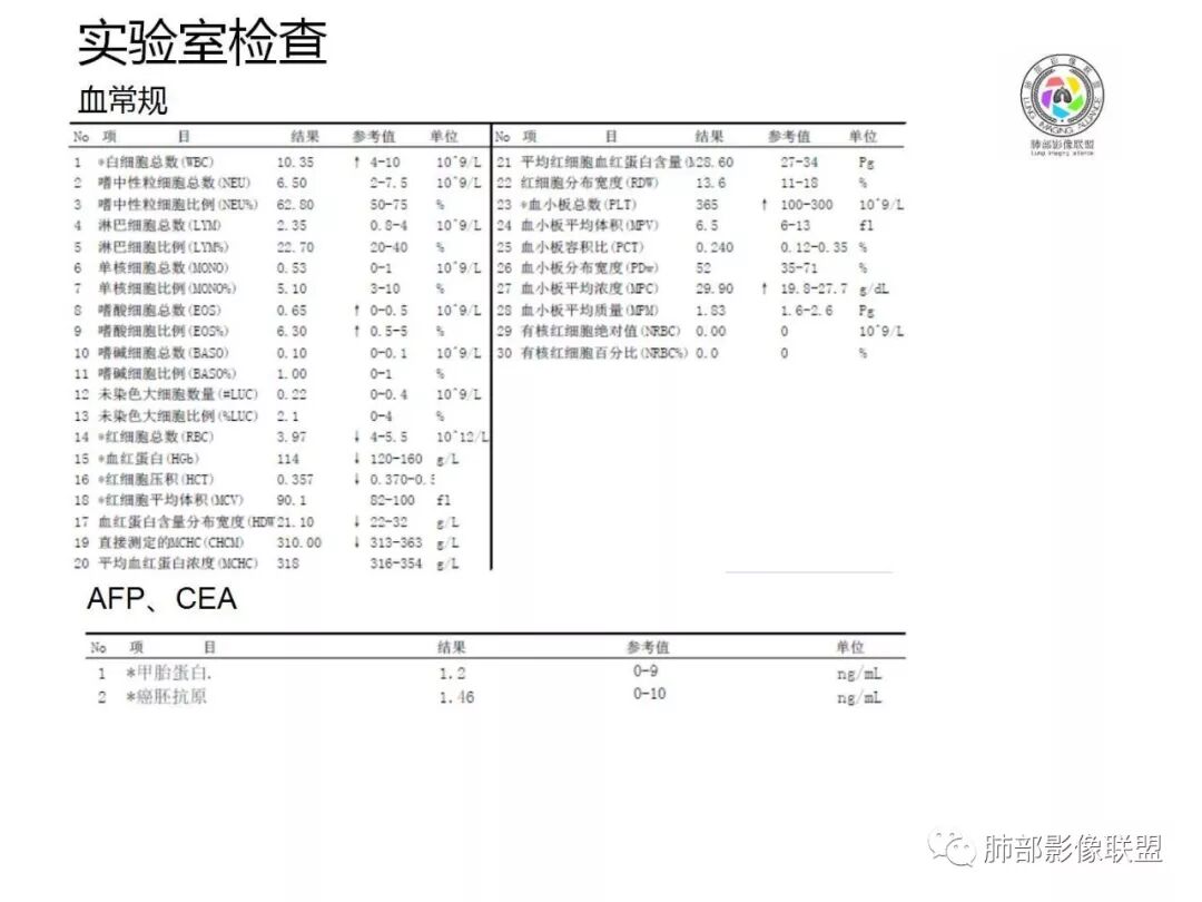 患者中老年男性,体检发现右肺占位。血常规轻度贫血,AFP、CEA正常,肝肾功能、血糖、血脂、心肌酶、电解质正常。胸部CT:右肺中叶巨大肿块灶,垮叶生长,可见分叶、毛刺、血管集束、支气管截断征象,远端周围可见小叶间隔增厚,增强轻度强化,内可见低密度坏死区,综合淋巴结肿大,且可见淋巴结内似低密度灶。综合考虑恶性,鳞癌并癌性淋巴管炎可能大。鉴别结核、腺癌。