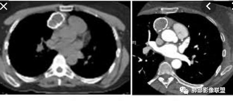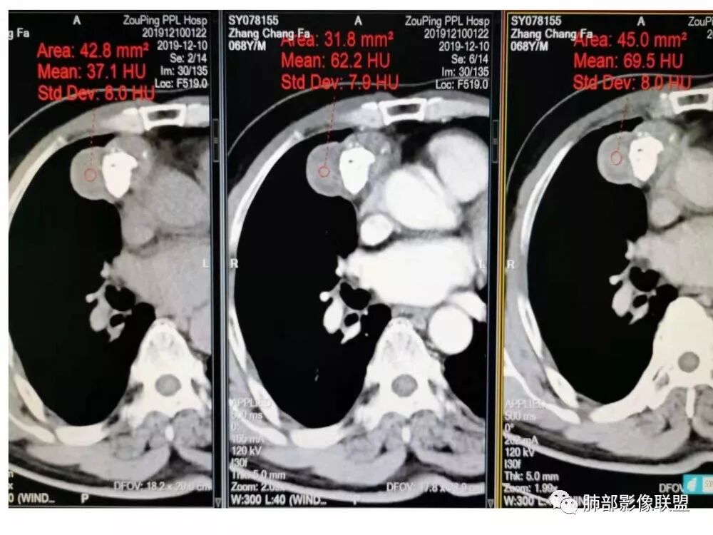 甄德强:病灶呈分叶状主体位于纵隔内,实性成分与钙化为主,钙化位于病灶中心,实性成分均匀延迟强化,考虑畸胎瘤,胸腺瘤。