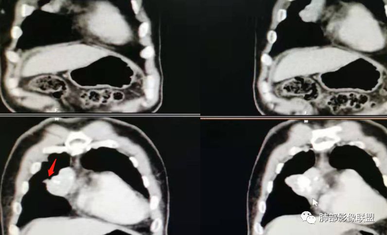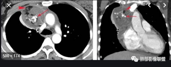 弹指之间:定位:1.非肺内来源,2.纵隔或胸膜来源;内乳动脉增粗,cor示与胸膜关系密切;