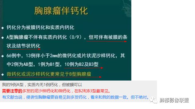纵隔或胸膜伴钙化疾病谱(吴婧):A:异位甲状腺——最常见,甲状腺癌非常容易钙化,一般与甲状腺相连,平扫因为摄碘,CT值很高,增强后则明显增高。B:畸胎瘤——脂肪、牙齿密度可识别。一般多发年轻30岁左右,钙化特点为块状钙化少见,环状钙化多见,钙化不在中间(偏心钙化)。很少强化或轻度强化 (王兆宇老师)C:CD透明细胞型——一般钙化为条状钙化,病灶形态通常为圆形、光滑、规则、全实性,不软所以不会见缝就钻,也不会坏死,强化非常高。D:胸腺瘤——一般30岁以后,容易钙化为A、AB、B1型,B2型以后钙化少见。钙化特点为大块状钙化、中间钙化。E:SFT——钙化会沿着胸膜的长轴生长。