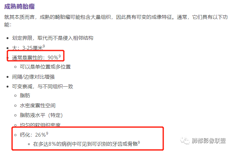 王兆宇老师:畸胎瘤总有油脂物质密度,块状钙化少见,环状钙化多见,头结节骨化多见,畸胎瘤钙化不在中间。