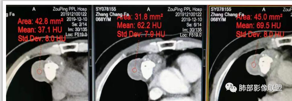 蓝天白云:定位纵隔,病灶呈实性成分,内见钙化,钙化位于病灶中心,实性成分均匀延迟强化,考虑良性病变,如果胸膜起源考虑sft,纵隔来源胸腺瘤,鉴别畸胎瘤。黄勇老师说过右侧心膈角区可以发生胸腺瘤