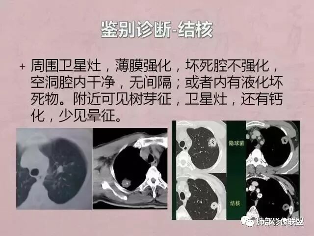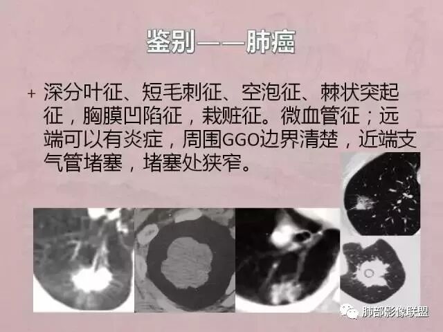 1、与炎性假瘤、恶性肿瘤鉴别:恶性肿瘤边缘膨隆,收缩也是毛毛糙糙的,炎性假瘤收缩力较强,边缘凹陷的多。隐球菌孤立结节收缩力弱,膨胀力也弱,与胸膜关系多为糊墙,部分有间隙。右边两幅可以看到胸膜增厚,胸膜下脂肪间隙增宽。晕中长毛刺,边缘平直,血管走行自然,鉴别肺癌。
