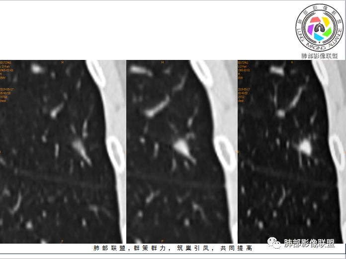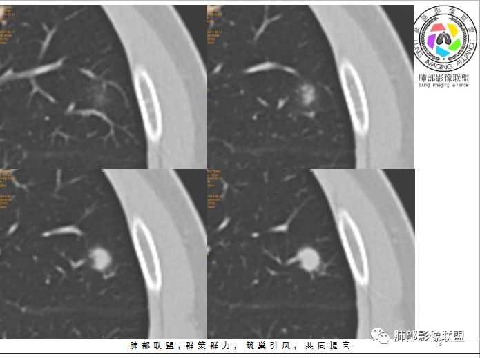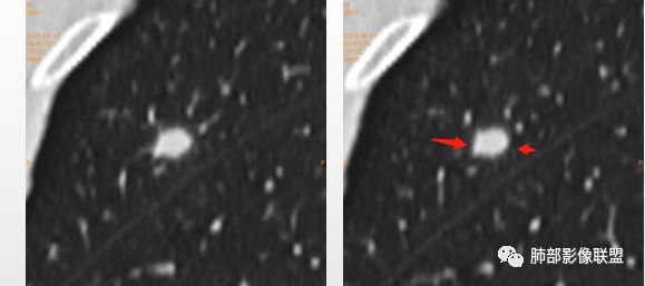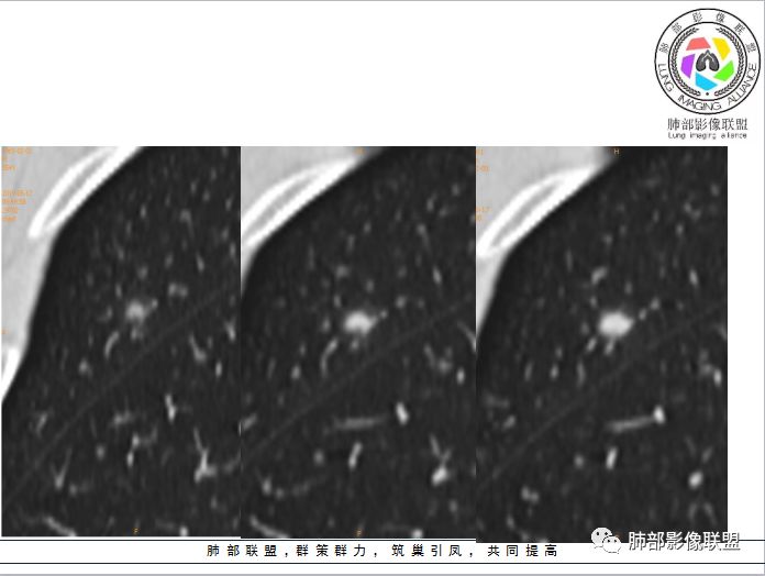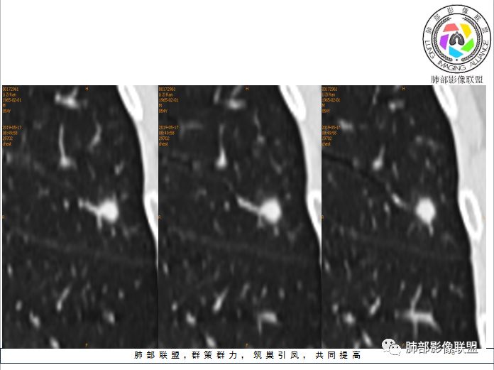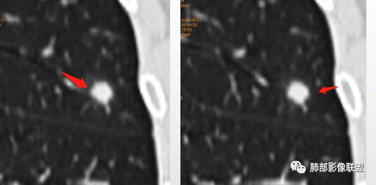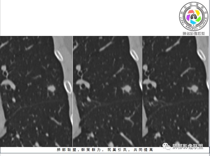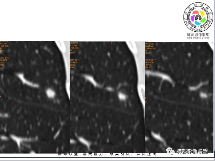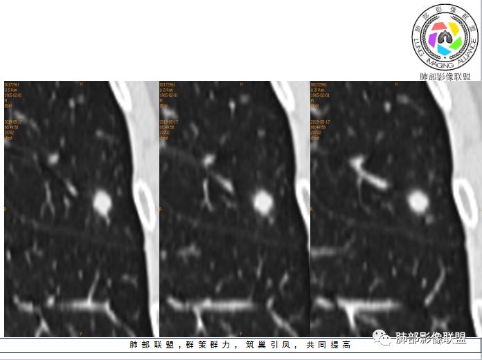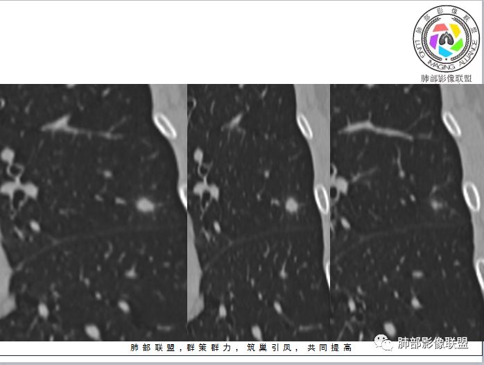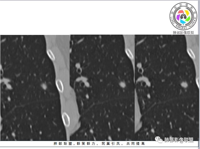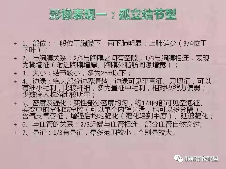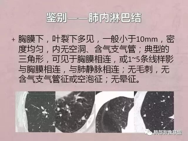 3、与淋巴结鉴别:淋巴结小于1cm,多位于胸膜下。结节周围不应该有晕,可以与血管相连,与胸膜有多条影相连