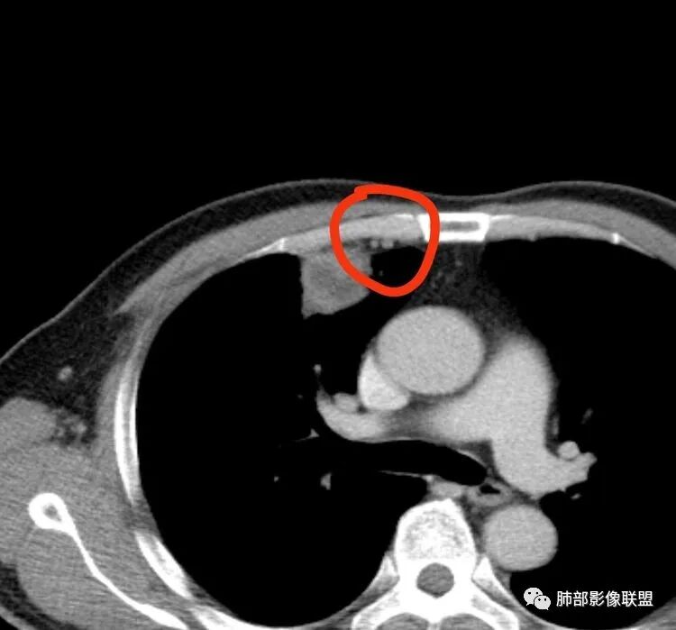 Coke with ice:胸膜外脂肪间隙增厚,有轻微的胸膜增厚…炎性特点。炎性肉芽肿+1。