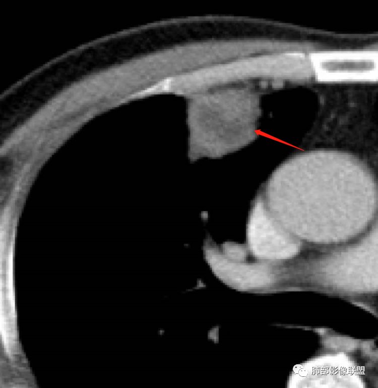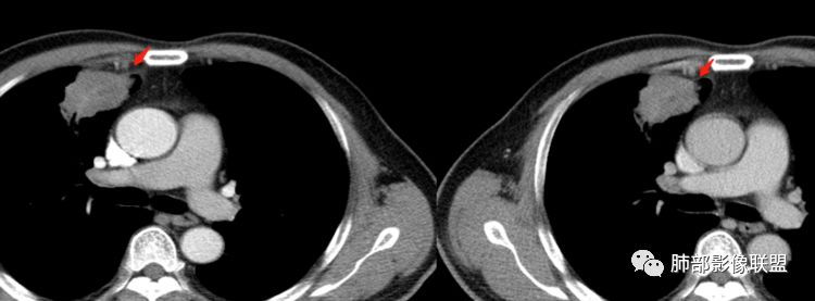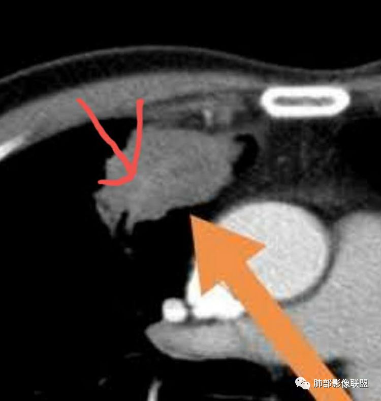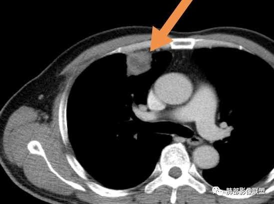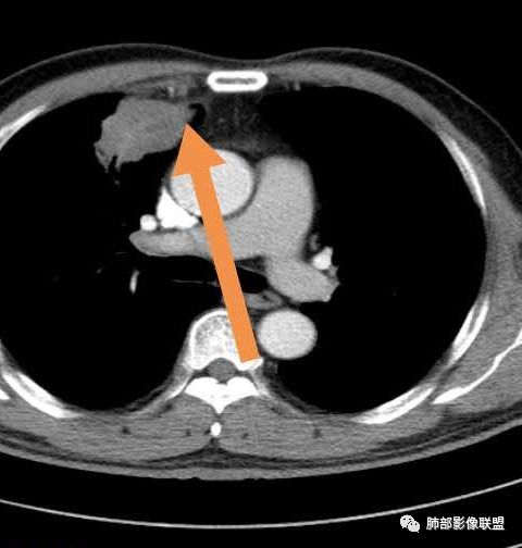 LiuC:顺便说一下“糊墙征”,有两点要注意,一是与胸膜之间接触是钝角,即宽基底与胸膜接触,二是一般不侵犯胸膜下脂肪。请注意,不是只要软组织密度病灶接触胸膜就是糊墙征。