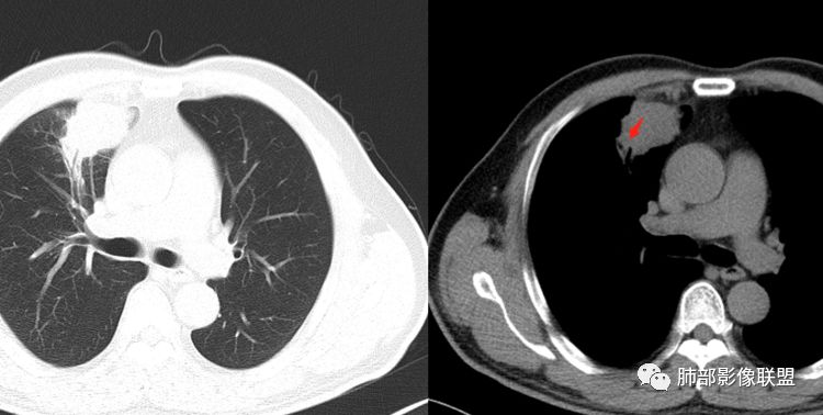 中老年男性,咯血,右肺上叶前段胸膜下肿块,大部分边缘平直,渐进强化,内有坏死,小支气管入肿块后闭塞,没有肿大淋巴结,考虑慢性炎症,结合临床咯血有小血管受侵,结核可能大。傅昌瑜:晨读,52岁男性,咯血6小时。右肺上叶前段肿块,部分边缘平直,部分有膨隆,支气管进入肿块后截断,肿块内偏远端坏死,壁厚薄不均,内见壁结节,考虑恶性肿瘤可能性大,最后一张图见走形自然的内有粘液的支气管,注意鉴别结核。