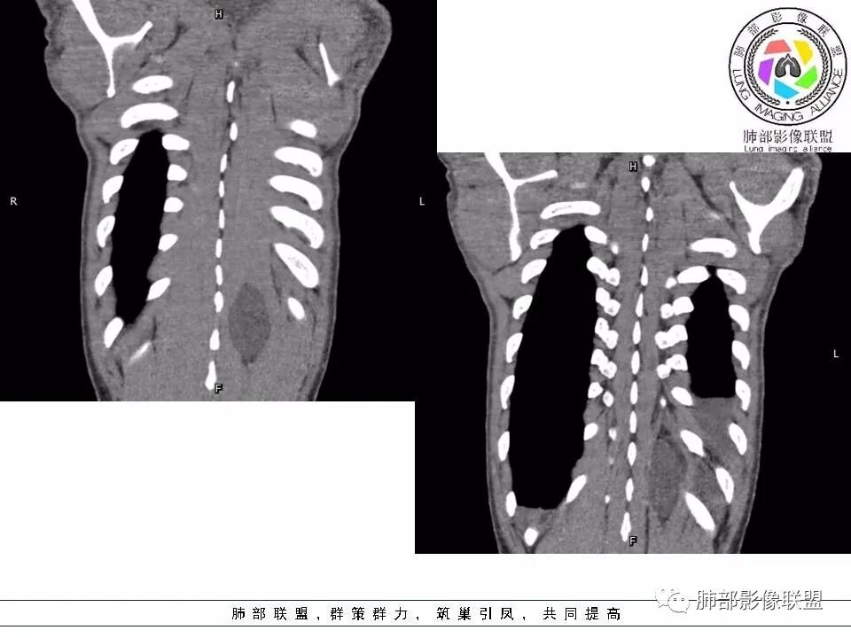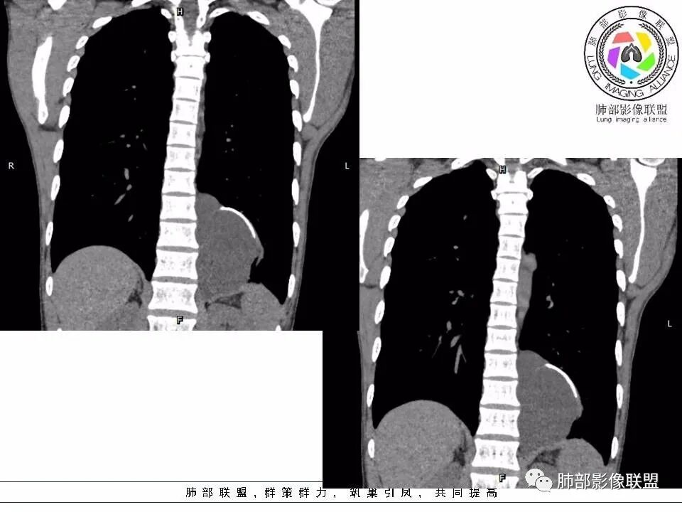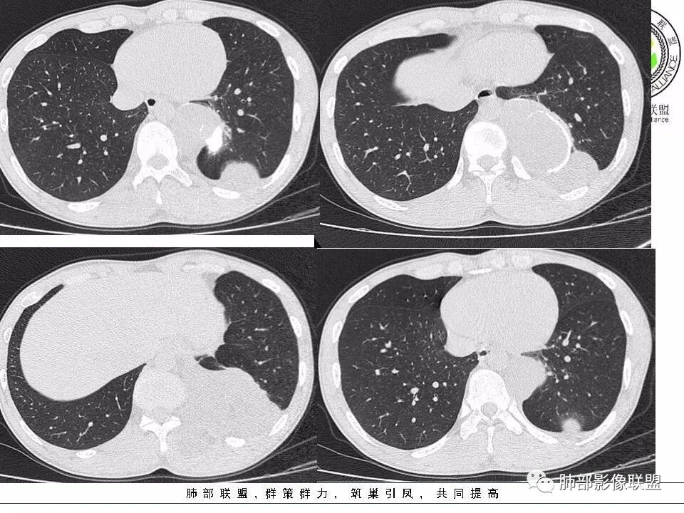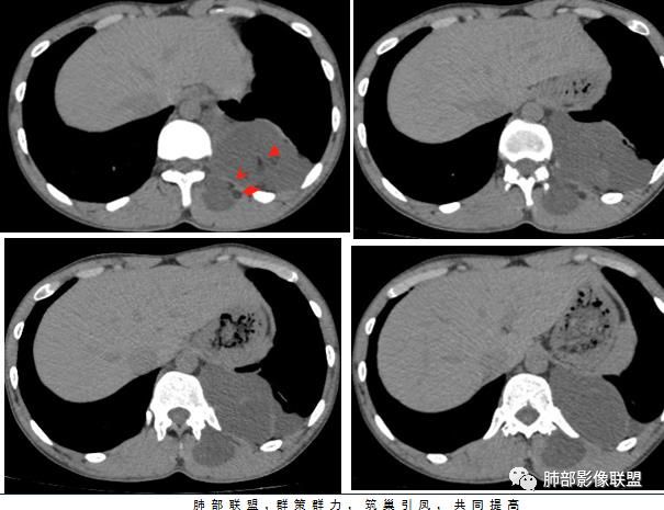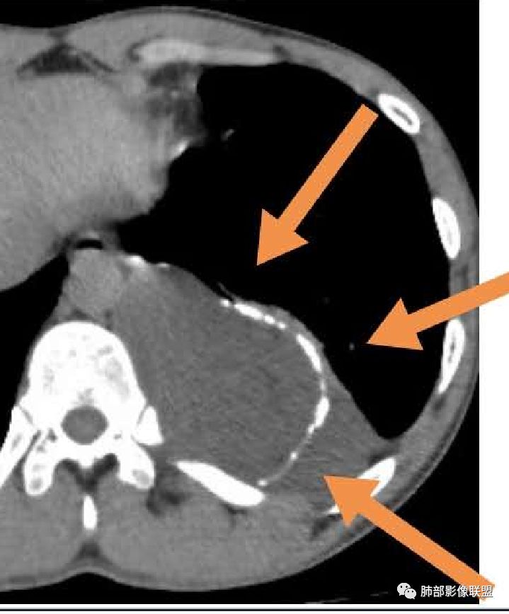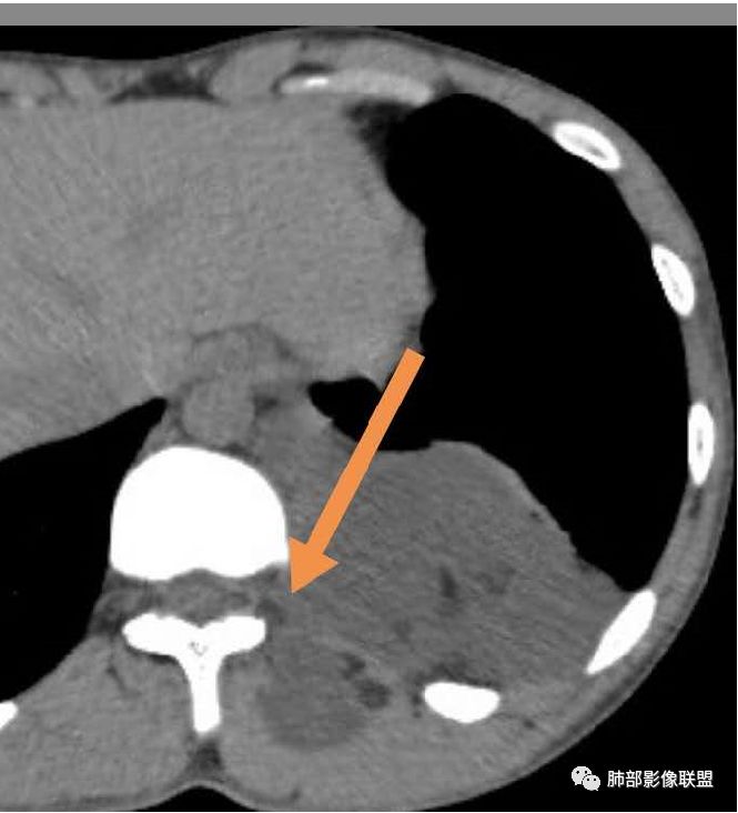 病灶与肺组织界面清晰,脊柱旁纵隔内不规则囊性占位,边缘(包膜?)钙化,蛋壳样应该是一个特点,脂肪,肌肉累及,考虑畸胎瘤可能。鉴别结核,如果是寒性脓肿,长轴生长符合,但是椎体没有病变,结核可以这样钙化吗?这里也有神经源性,淋巴管来源病变,囊性占位,是不是都得鉴别一下啊