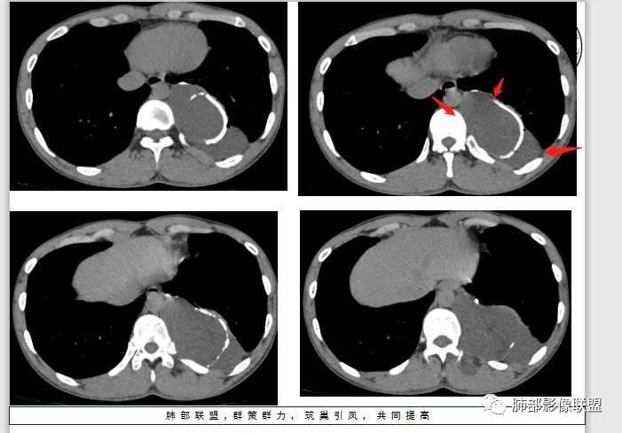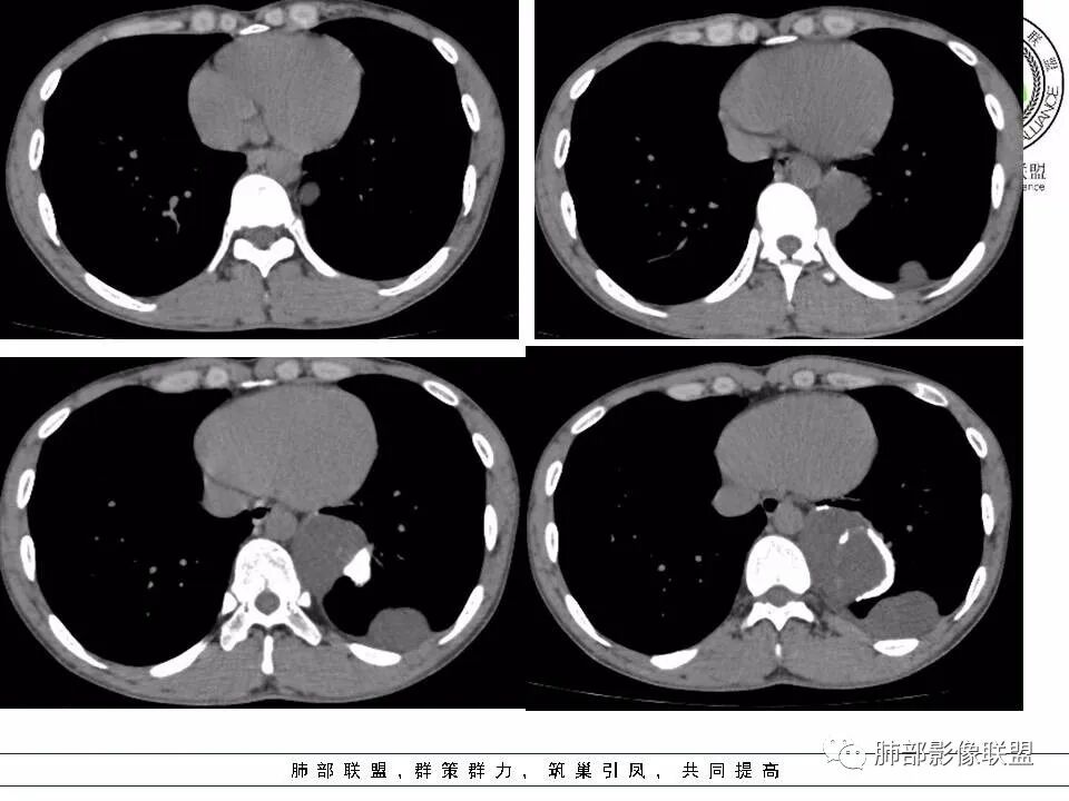 青年男性,左下靠近脊柱旁,多发软组织肿块,一个靠近主动脉旁,有钙化,一个在左下胸膜下,一个在肌肉里面,考虑来源胸膜下,考虑侵袭性纤维瘤?神经源性肿瘤?