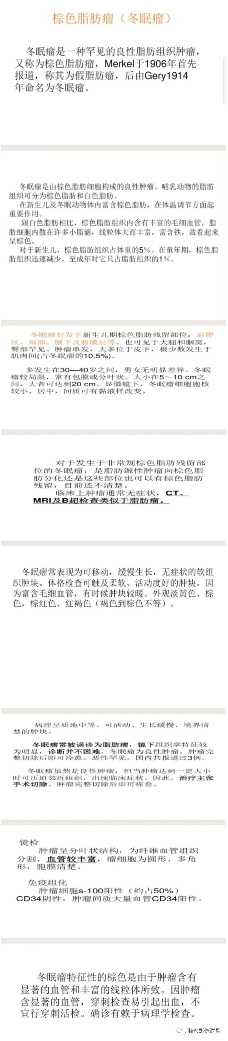 4.冬眠瘤为含有棕色脂肪成分的脂肪瘤,又称为棕色脂肪瘤,因类似冬眠动物的冬眠腺而得名。良性,生长缓慢,好发年龄30-40岁,男性稍多。血管丰富有时会触及局部皮温相对高。