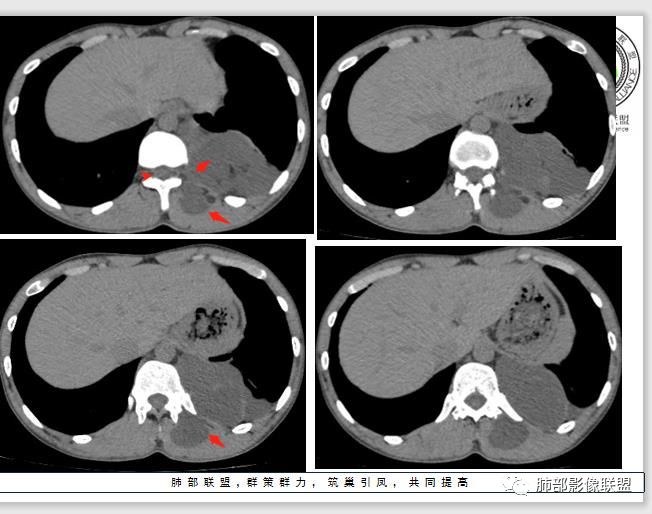 主病灶位于左侧脊柱旁,以水样密度为主,有少许脂肪成分,边缘钙化,邻近胸腔及后胸部受累,见类似成分,且后胸部病灶变大。邻近椎体及肋骨未见异常。综合考虑畸胎瘤伴局部破溃累及邻近胸膜和后胸壁可能大