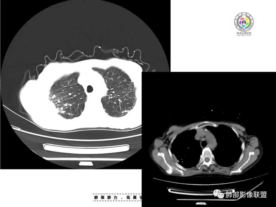 2.能够完全将尘肺排除在外吗(如II期)?不能!左肺内中带较均匀分布的较均匀是具有尘肺影像学特征而不支持结核血播的。此外双肺门及纵隔淋巴结钙化也更多见于尘肺,尤其是矽肺。