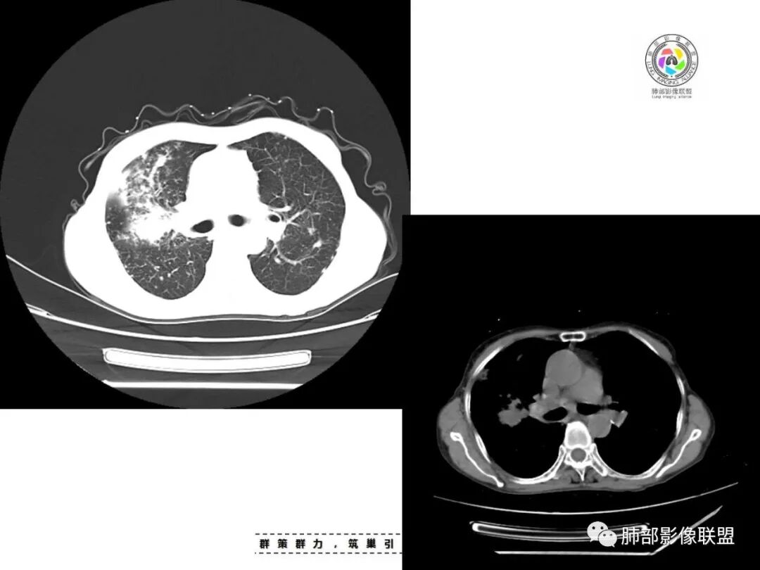 老年女性,咳嗽咳痰半月,肺部听诊痰鸣音。影像以右上肺实变?肿块?与支气管关系不清晰;另见两上肺结节、条索,胸膜局部增厚有钙化点,纵隔肺门淋巴结见钙化。综合考虑结核可能性大,注意肺癌。完善增强及支气管镜等检查。