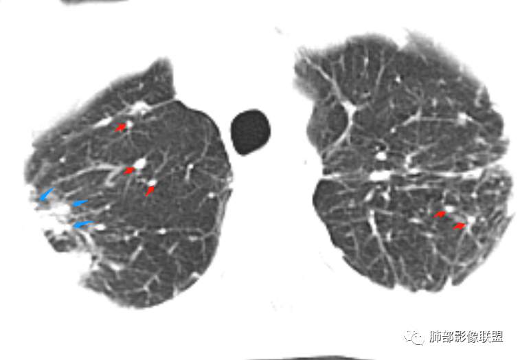 *小结节,直径2-5mm,边缘清楚或不清楚,小叶中心性和胸膜下。
