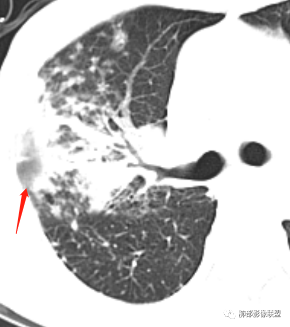 2.病灶上肺为主,胸膜下分布为主。双肺病灶明显不对称,右肺块状影较大。