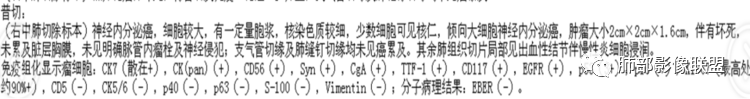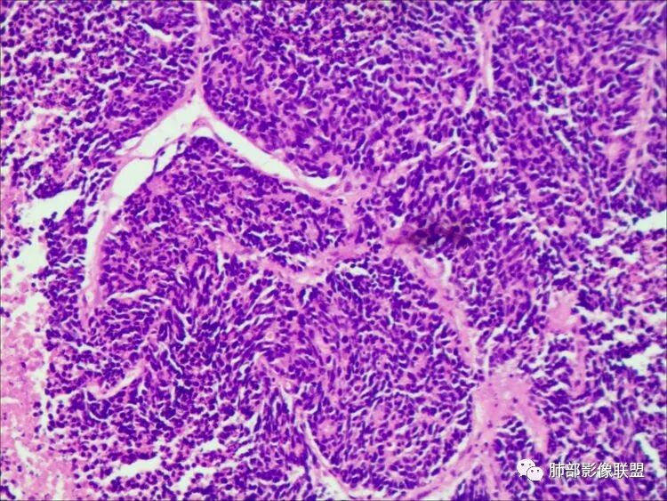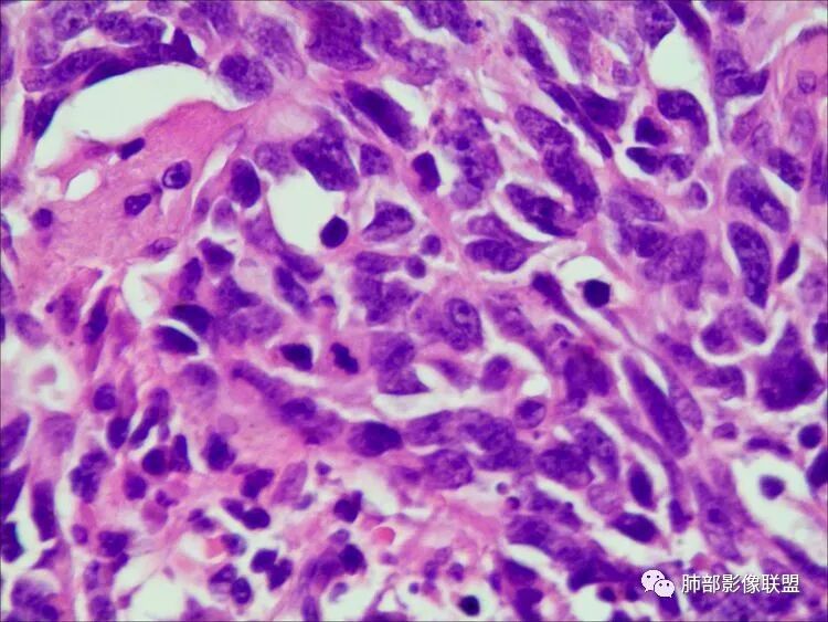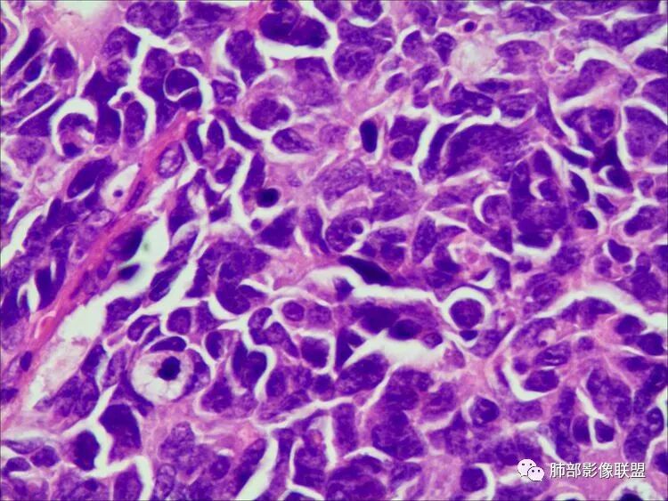 影像上孤立病变,与支气管关系不密切。病理上核大深染,支持恶性肿瘤,小细胞,大细胞,大泌鉴别