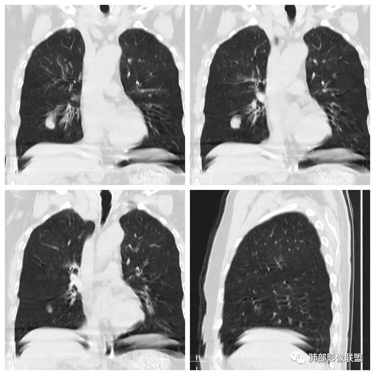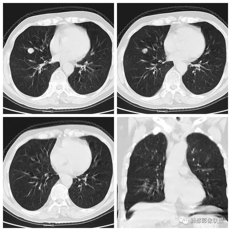 小兜:老年女性,吸烟史,体检发现右肺中叶外侧段类圆形结节,周围浅分叶,冠状位似见支气管进入后截断,未见脂肪及钙化