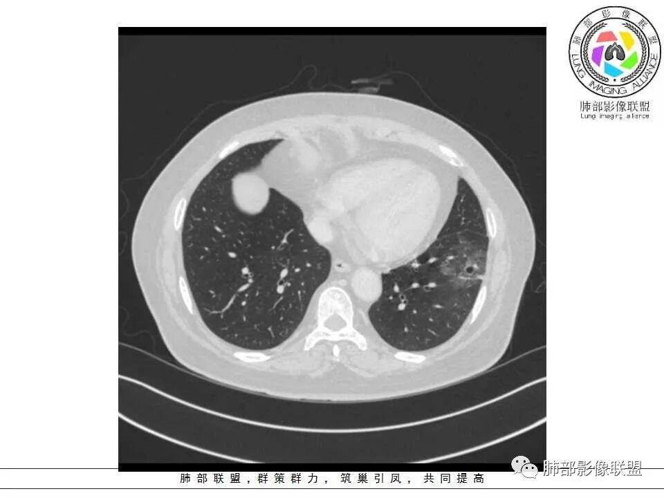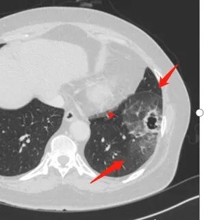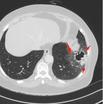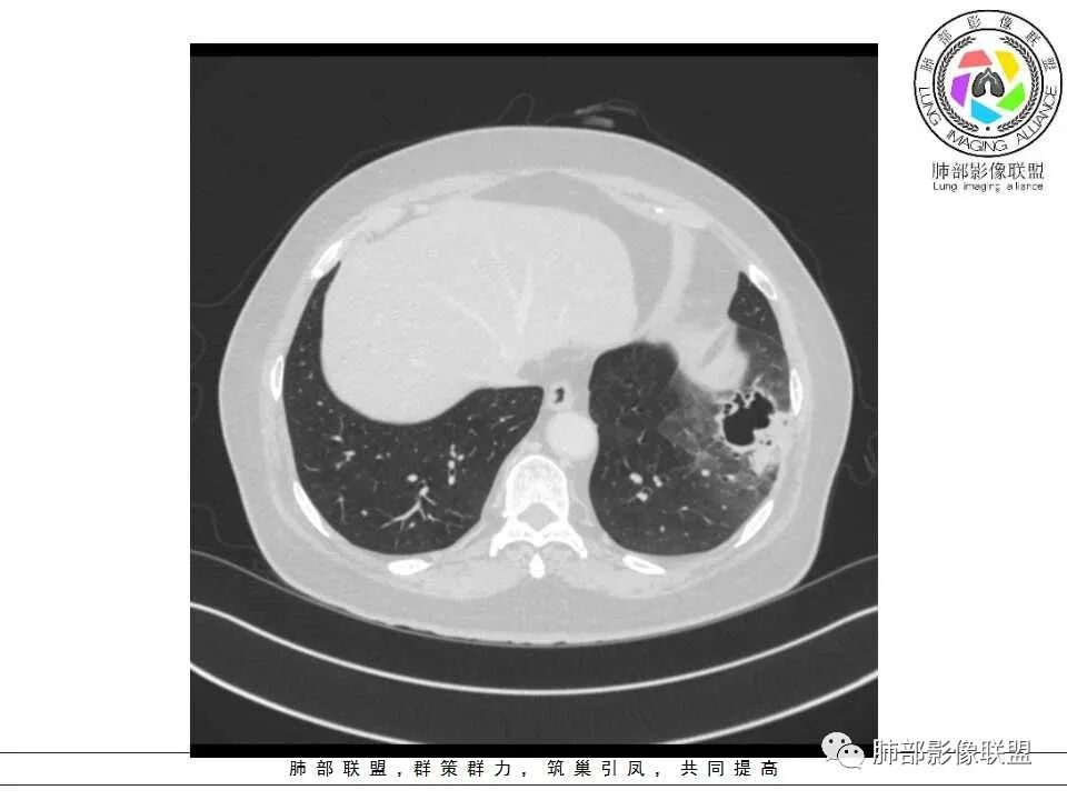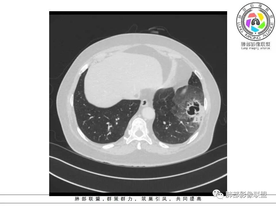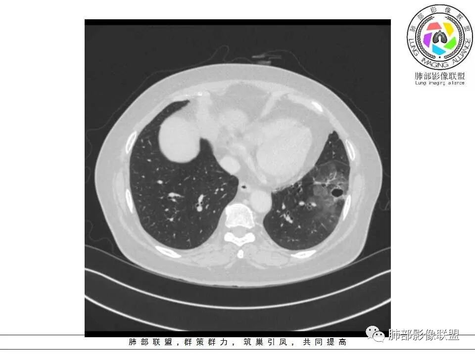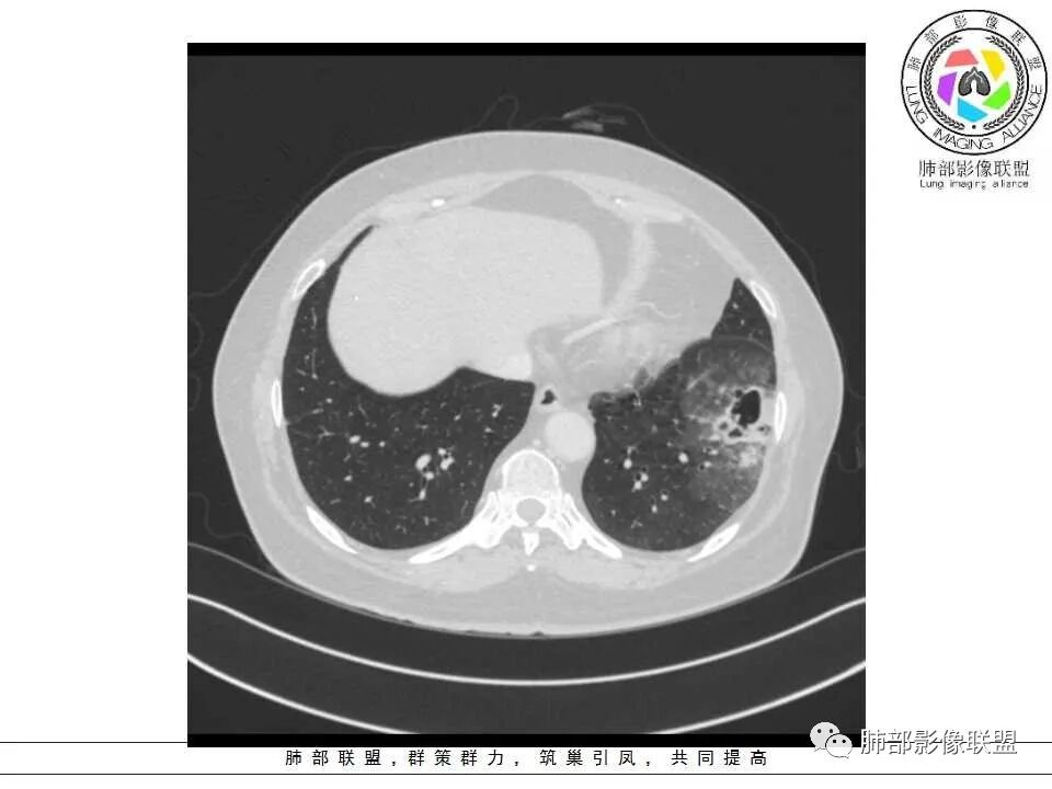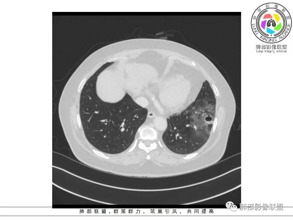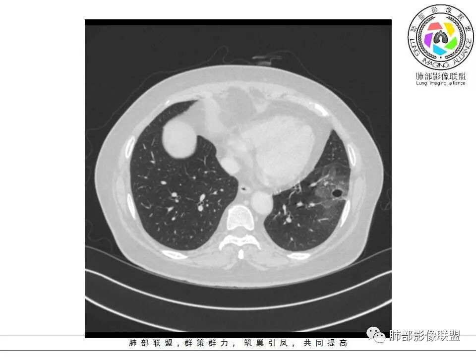 患者老年女性,受凉后咳嗽,咳痰,发热,左肺下叶不规则空洞结节,周围大片磨玻璃影,倾向恶性。