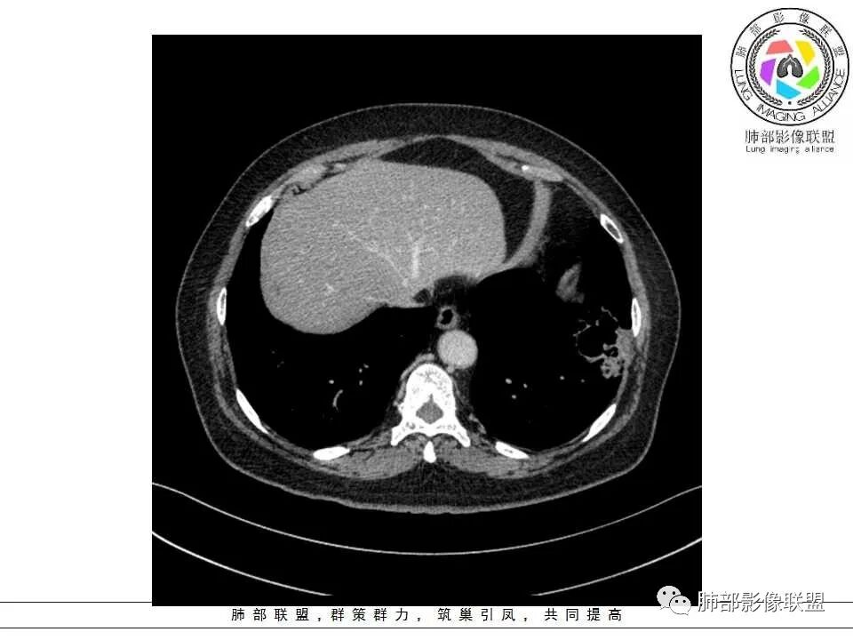 女性,65岁,左肺下叶空腔边缘见不规则结节,结节强化轻、不均匀,局部坏死边界较清楚,胸膜为糊墙为主,膈面胸膜判断不清楚似有结节;空腔内见分隔,或者数个融合,局部张力稍弱,边缘见支气管截断和血管集束;外周见大片磨玻璃影,部分边界模糊。结合病史炎症肯定有,但是囊腔结节这部分感觉恶性征象多过良性,考虑囊腔型腺癌可能性大,鉴别肺大疱感染