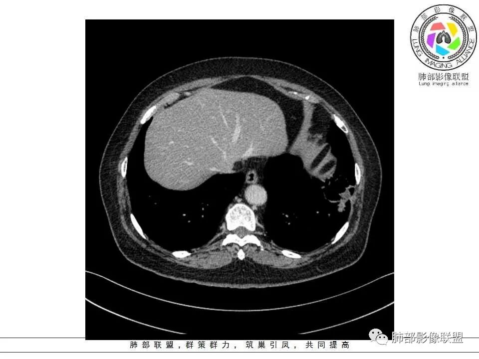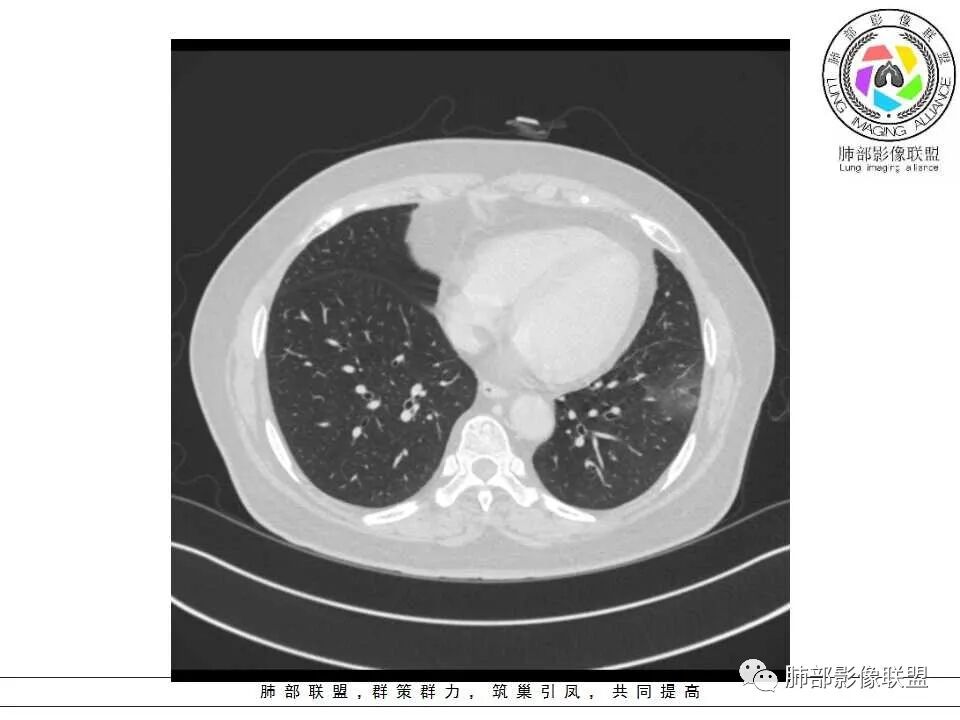 3、灶周环以大范围磨玻璃影,非常均匀,没有重力分布趋势,分叶状,边界隐约可变。