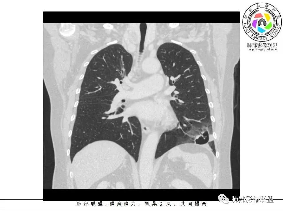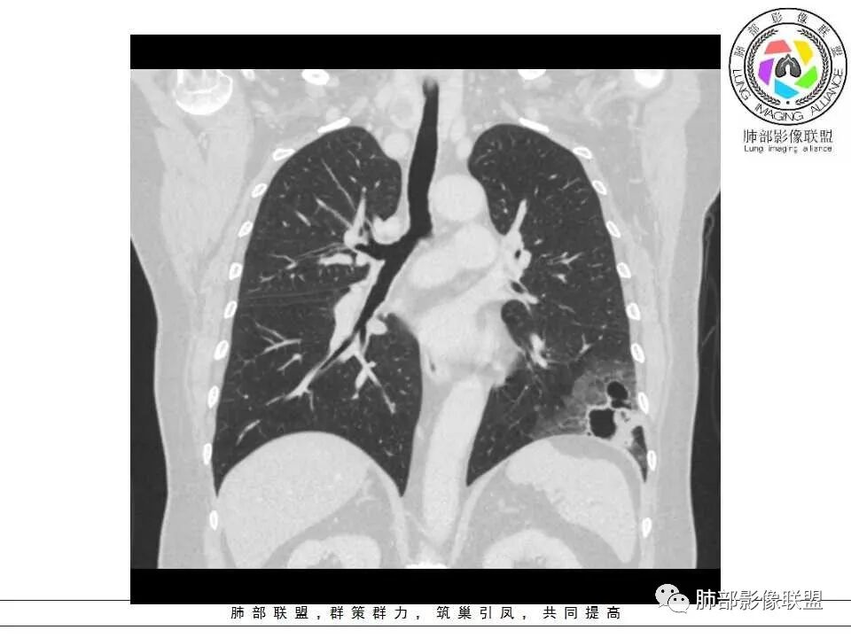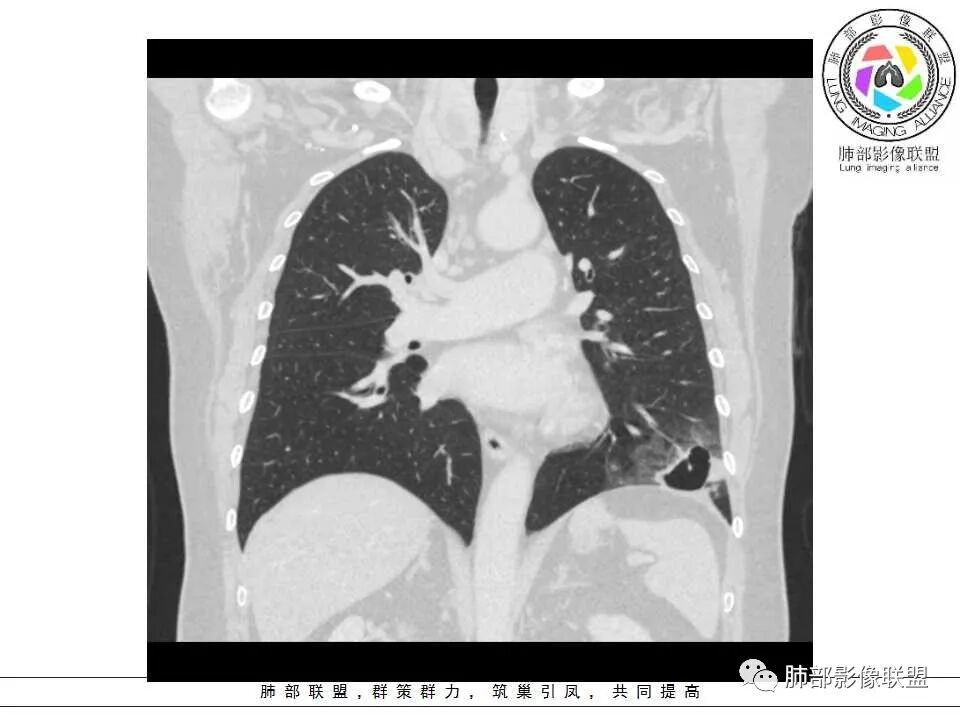 胸CT:左肺下叶囊腔,壁厚薄不均,可见壁结节,囊腔内可见断裂小梁,部分融合,周围边界较清楚GGO,胸膜牵拉,可见血管集束、支气管充气征,冠状位部分层面可见支气管在囊腔边缘截断。考虑:囊腔型腺Ca。鉴别:肺大疱感染,CPAM等。