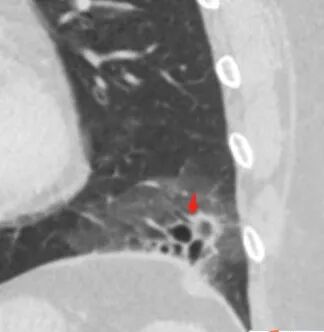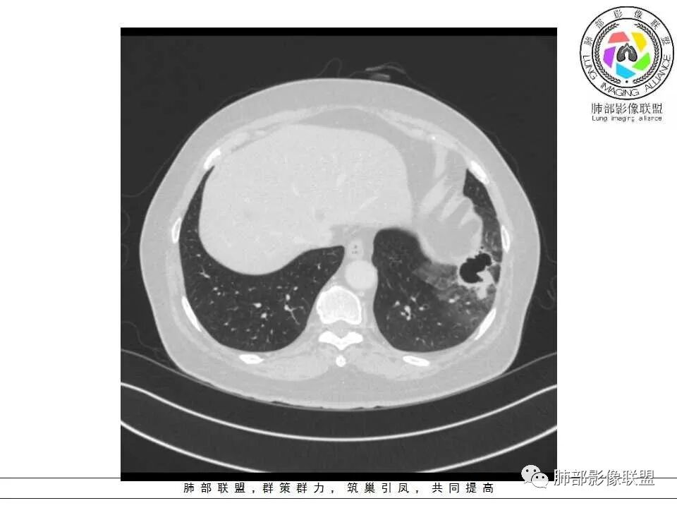 老年女性,受凉后咳嗽咳痰发热两天,近两天咳嗽加重。CT示左肺下叶不规则空洞伴局部洞壁结节,空洞内见分隔,似见扩张支气管相通。空洞周边伴大片磨玻璃影。结节与胸膜宽基底相连,轻度强化,考虑为囊腔型腺癌伴感染