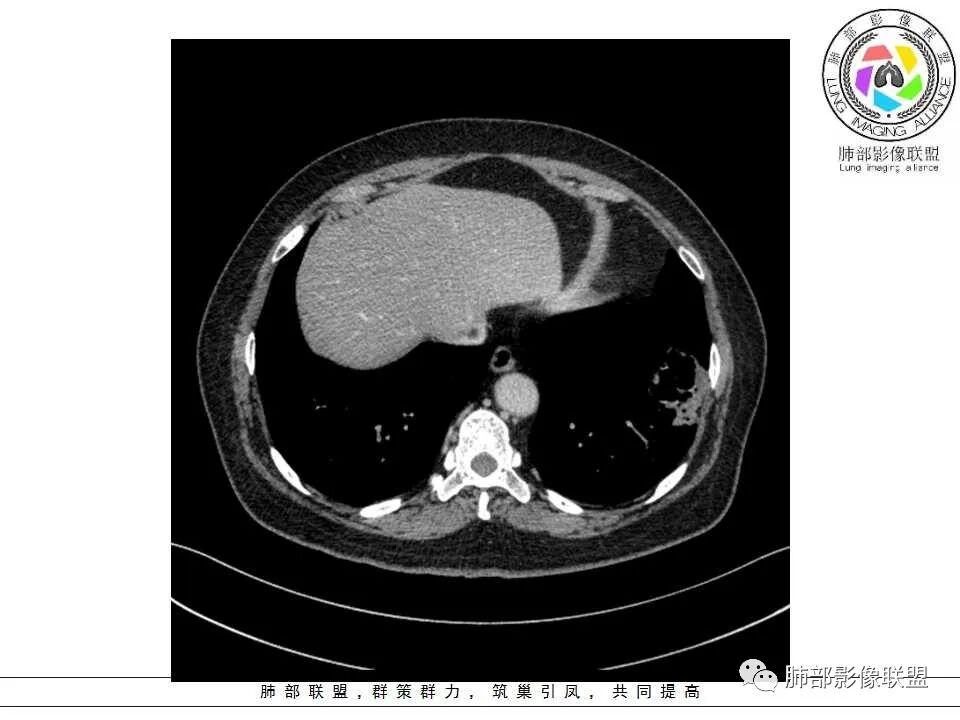 右肺下叶假大空,内可见分隔,壁不规则,周围大片磨玻璃影,部分边缘模糊,胸膜受累增厚,肝脏多发囊肿,考虑囊腔型腺癌。