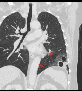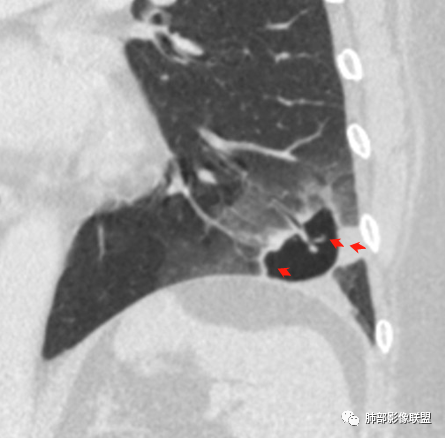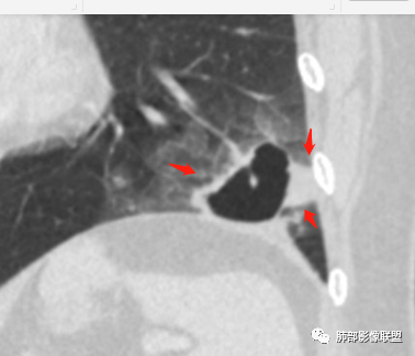 4、冠状位部分层面可见支气管在囊腔边缘截断。