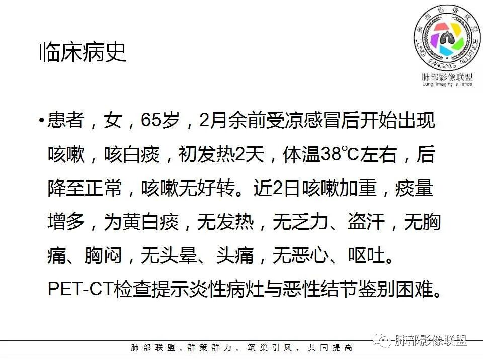 患者,女,65岁,2月余前受凉感冒后开始出现咳嗽,咳白痰,初发热2天,体温38℃左右,后降至正常,咳嗽无好转。近2日咳嗽加重,痰量增多,为黄白痰,无发热,无乏力、盗汗,无胸痛、胸闷,无头晕、头痛,无恶心、呕吐。PET-CT检查提示炎性病灶与恶性结节鉴别困难。