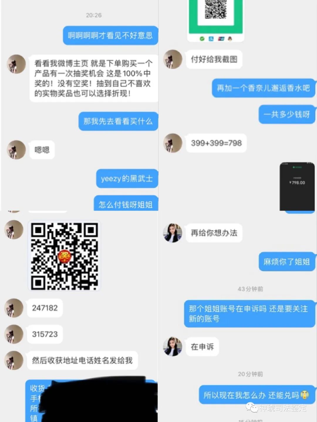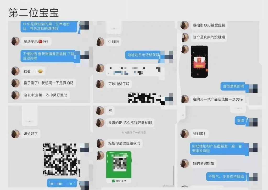 这类骗局虽然老,但是现在微博上还存在,比转发抽奖类更加直接,声称只要购买产品即可抽奖,并且会在微博公示每个中奖者的聊天记录,增加活动的真实性。