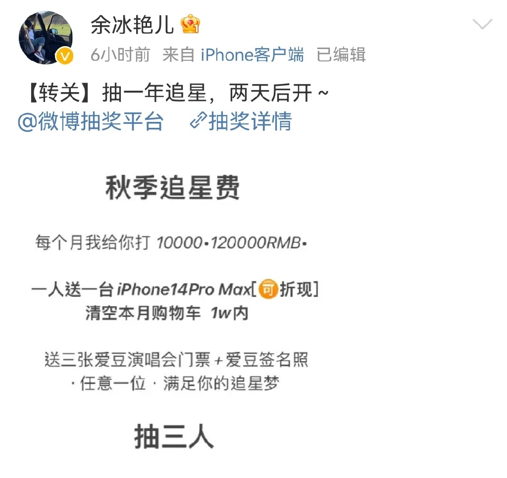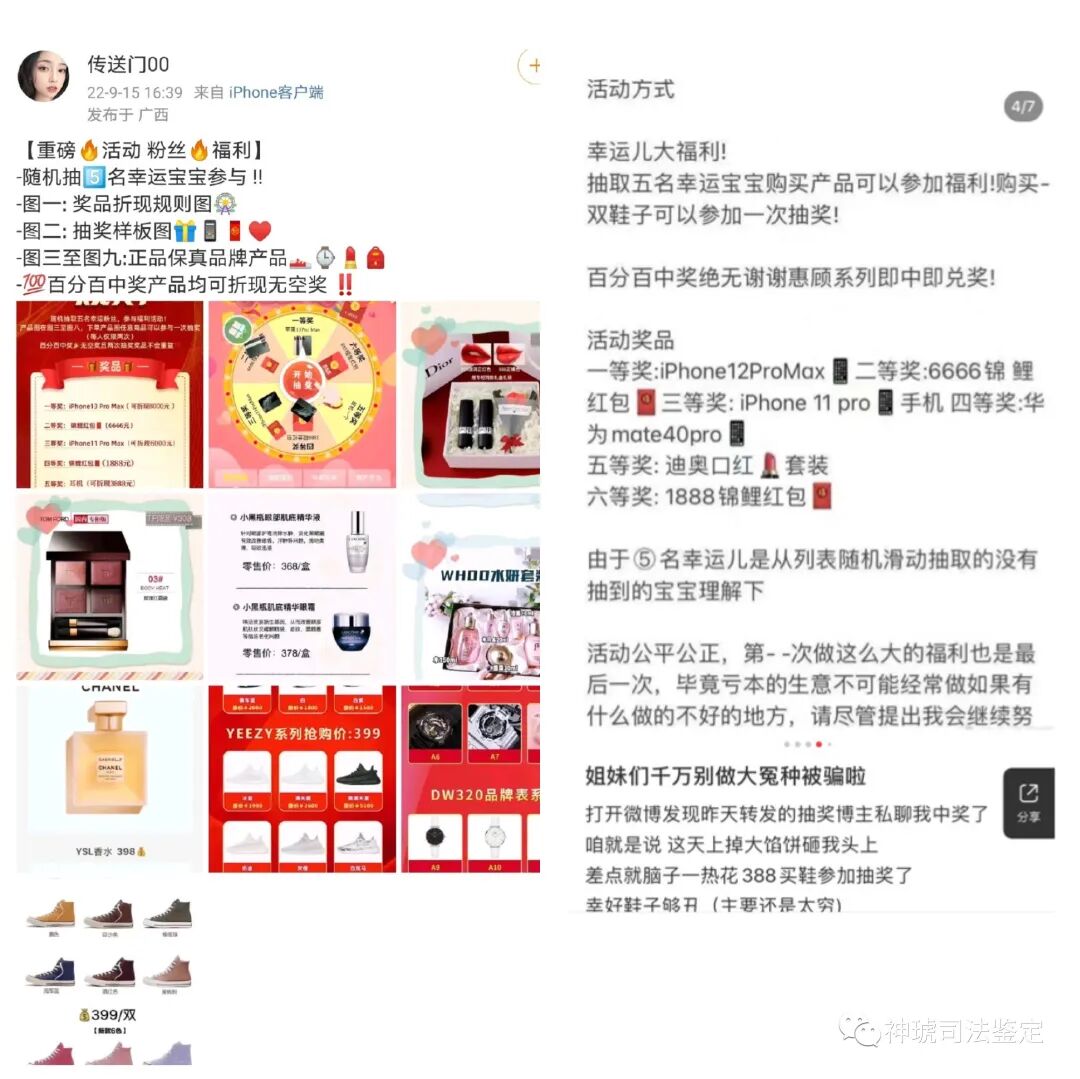 这类骗局以手机、现金、名牌包等奖品为诱饵,以涨粉或者推广为理由,声称只要转发和关注,或只关注就有机会参与抽大奖。