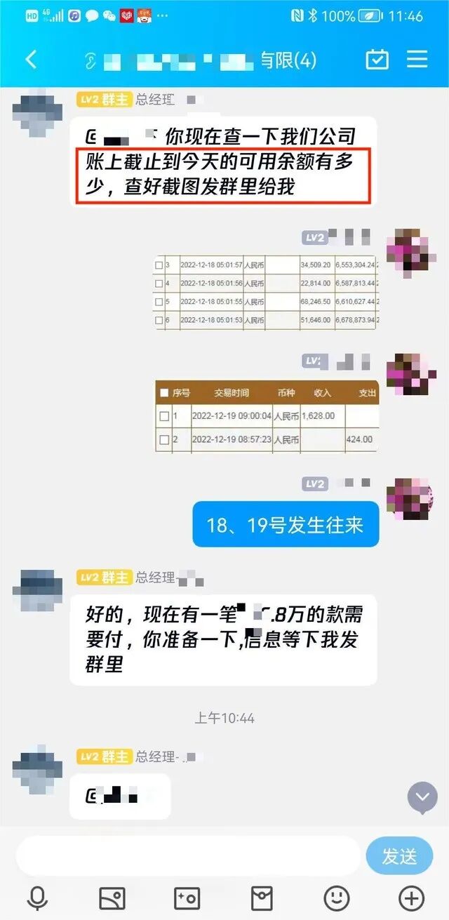 12月19日,反诈骗中心接到某公司会计冯某(化名)报警称:QQ上莫名其妙被拉进一个群聊,群聊名称是公司全称,群内已有总经理、监事、董事3人,他们在谈论公司业务,形成了一个“小范围”核心聊天圈。冯会计被拉进群后,看到总经理告诉董事林某,由于自己正在外谈事情,一时间不方便接听电话,如果有事情及时在群内告知联系,对话期间还随口让冯会计查询一下公司账户余额。