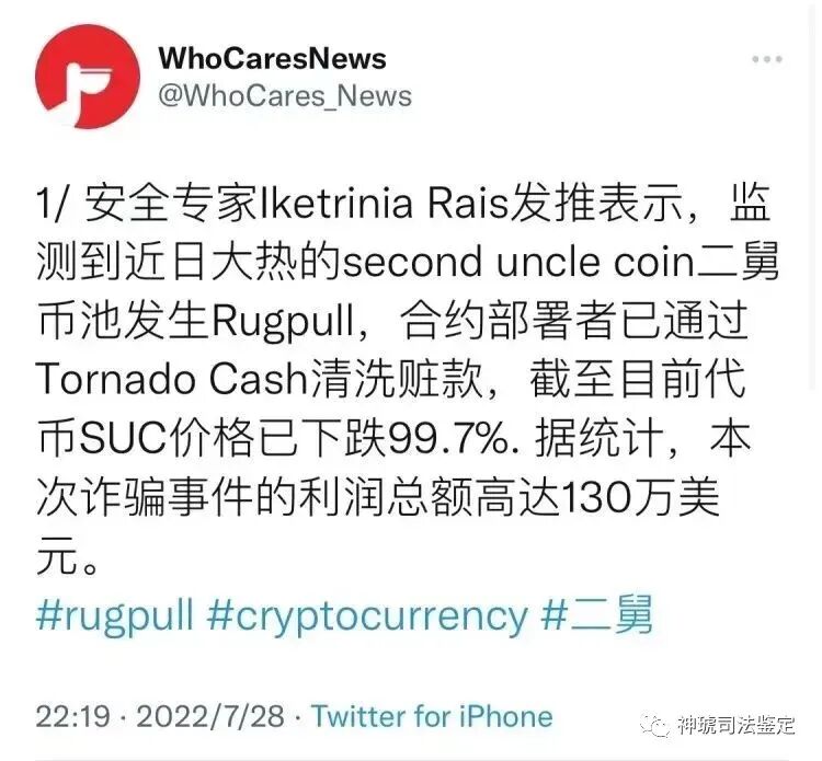 7月28日晚,推特Whocarenews以“安全专家”名义锤二舅币,发行人卷款130万美元跑路的消息不胫而走,二舅币于当日迅速暴跌。7月31日,二舅币崩盘登上微博热搜。