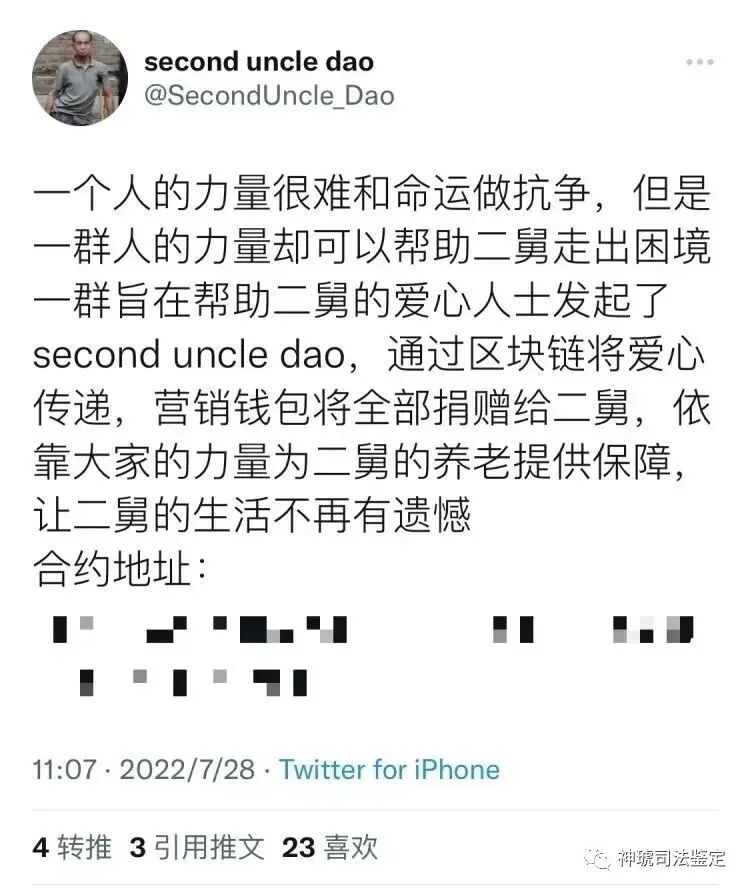 也正是这时,二舅币随着热点出现。7月28日,推特账号「second uncle dao」发了一条推特,以帮助二舅的名义,发起二舅币数字货币,部分人参与购买。