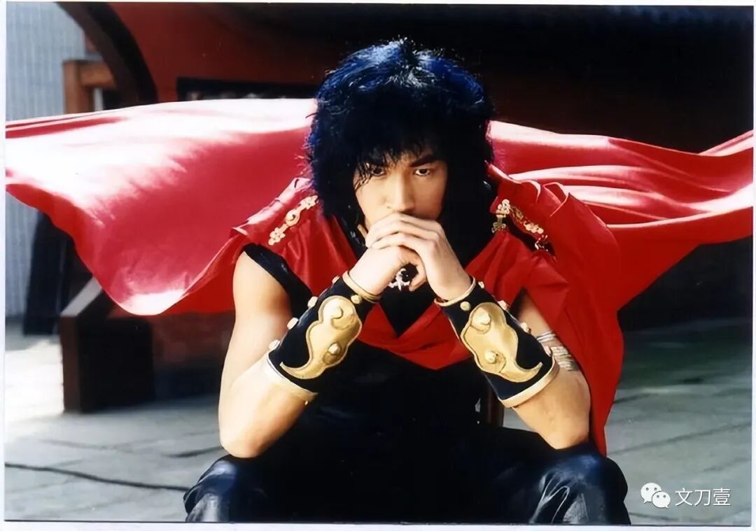 穿着一身黑红色皮衣,顶着一个泡面头,手里拿着一把不同于以往影视剧的剑,肩膀后,那一张披风飘逸自然地扬着。