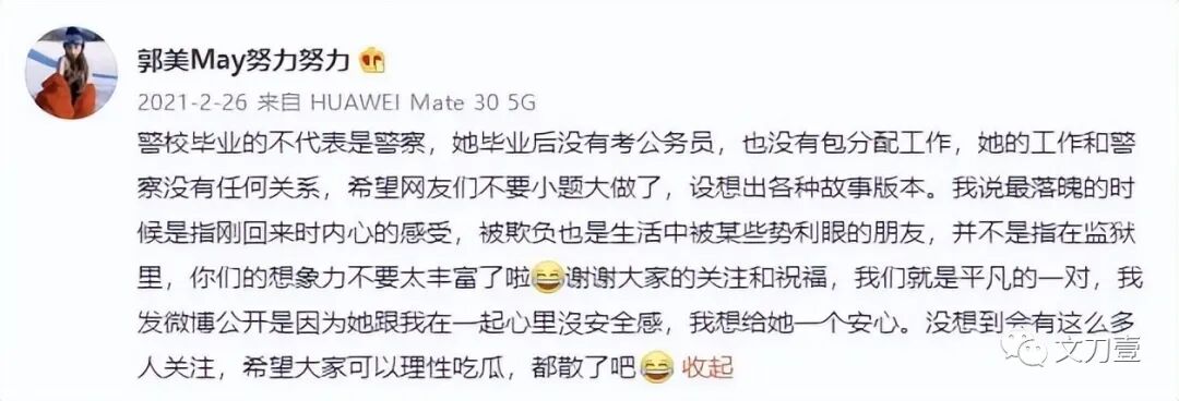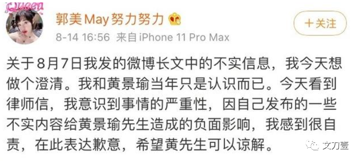 郭美美又发布了一条道歉文,称自己之前说的都是不实信息。